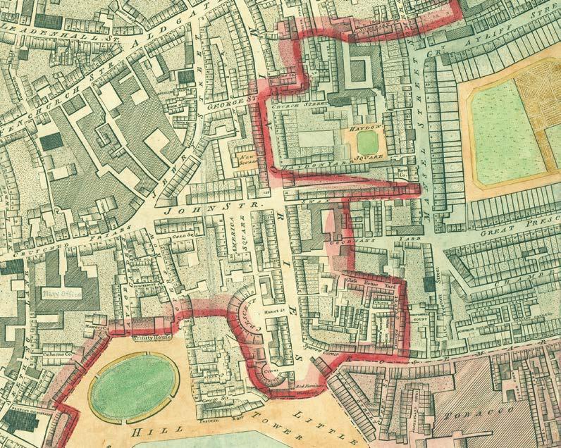 The Minories and nearby streets, showing premises occupied by Moore, Blachford, Imray and Steel at various times.