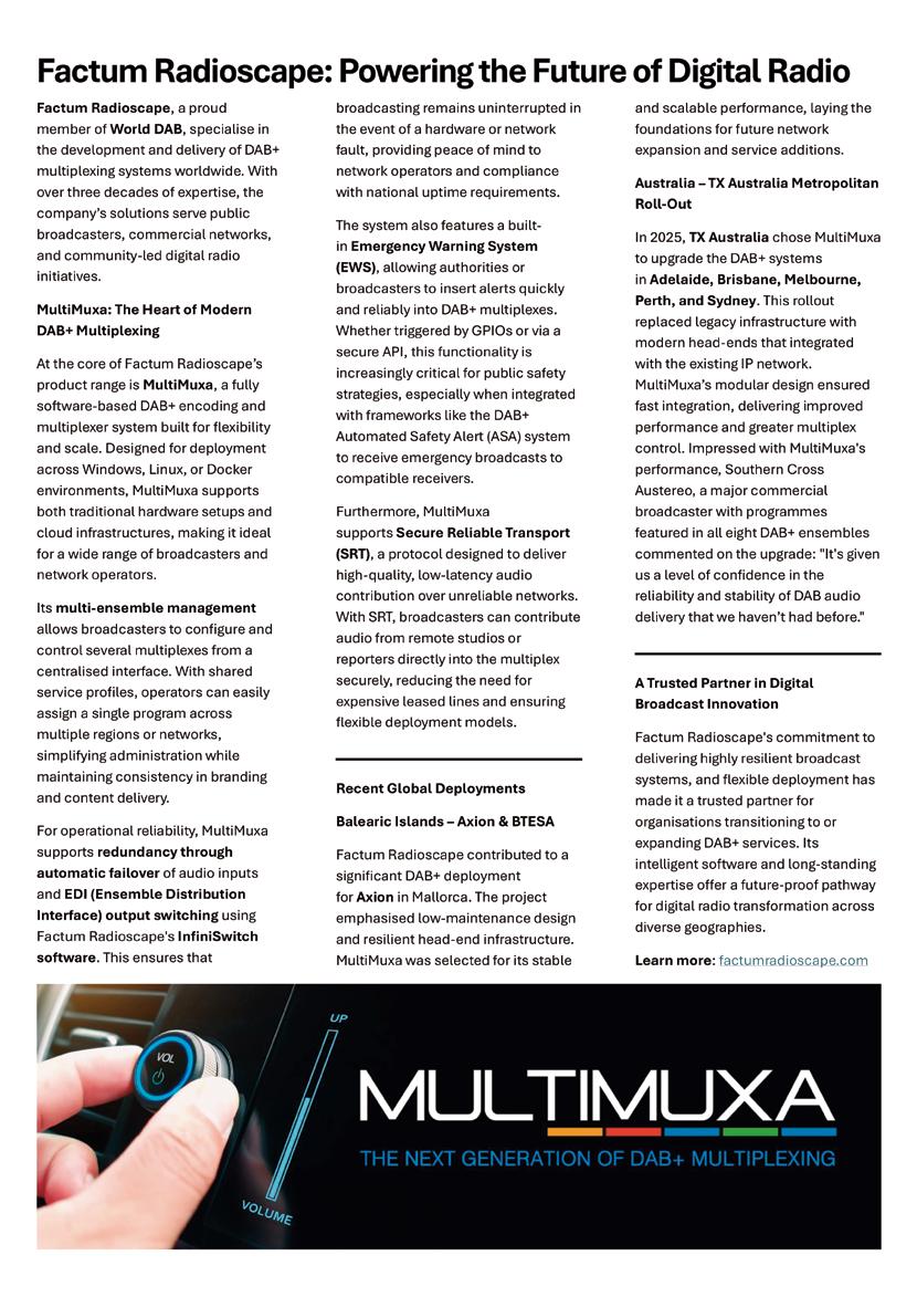 WorldDAB — the global industry forum of which I am very proud to be President — continues to be ready to support the increasing number of markets around the world seeking to implement DAB+ to provide robust and future-facing broadcast radio.