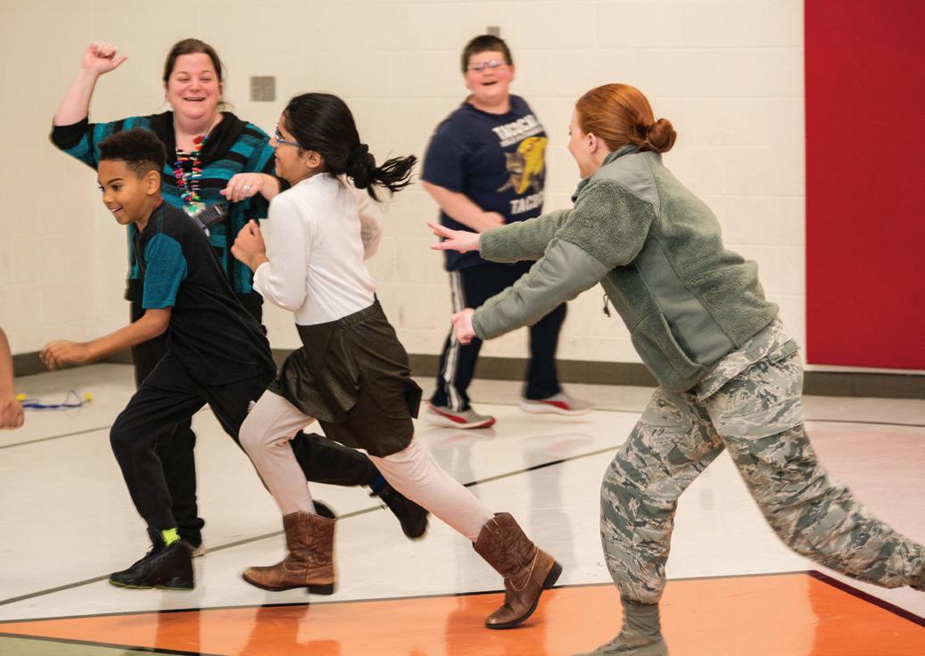 Students from the Mary C. Snow West Side Elementary School in South Charleston, W.Va., interact with members of the West Virginia National Guard during the after school mentoring program. Maj. Stacy Brown, Drug Demand Reduction Program (DDRP) coordinator, joined several colleagues to participate in activities with students, including an old-fashioned game of shark and jump rope.