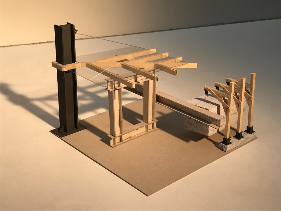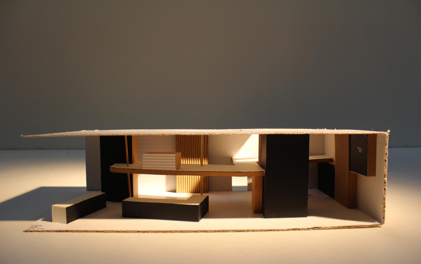 Contrary to figurative transparency within a layout in a composition, transparency in a more literal sense is demonstrated in this workpiece. Although clearly not following Fibonacci’s sequence that was introduced in this lesson, another sort of succession was created by cutting diagonal lines through a mass. This mass would then be divided into nine separate planes, which would be doubled and mirrored on a central axis to create two groups of vertical, free standing planes. They superimpose each other to generate a (transparent) volume. By interweaving and overlapping the two groups to the point of contact, the figurative sense of transparency is once again of large influence and a sense of interconnection is implied. Once again, layers or levels are present, only this time on the vertical axis. This effect of transparency consequently affects the behaviour of light and shadow which fall onto andthroughthesurfaces.Thecutsmadethroughonesideof the sequence establishes a spatial quality within the ‘wall’, and therefore results in a play of light on its end faces.