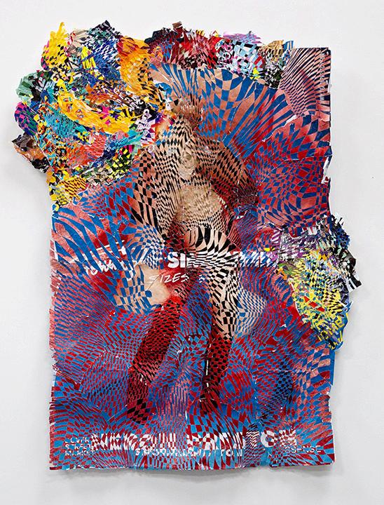 20) Galen Gibson-Cornell, Heron, 2024 found street-posters from New York City, Berlin, Hamburg and Poznan, sliced and woven, 78 x 58 in
