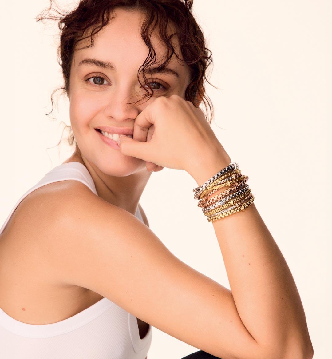 “I love FOPE's Flex’it Bracelet for all the obvious reasons! Its stretchy, roll-on construction makes it incredibly easy to wear; it's important enough to wear alone or can be stacked with all your other arm candy. My pick from the Eka collection is especially fabulous because of the distinguished high-polished links.” -Kaitlyn
