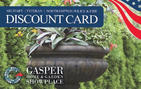 Gasper offers a 15% DISCOUNT year-round to honor the service of our proud active duty and reserve U.S. Military service men and women, Veterans, Police and Firemen. Show your military ID and a photo ID at checkout to receive our special thank you! See a store associate for details. Savings for Those that Served MILITARY DISCOUNT CARD CONSTRUCTION UPDATE Gasper’s New Hardscape Store and Landscape Design & Construction Office is Open for Business! Located at: 501 Camars Drive, Warminster, PA 18974 Gasper Home & Garden Center | 316 Tanyard Road, Richboro, PA | 215-703-9404 | www.gaspergoods.com 5
