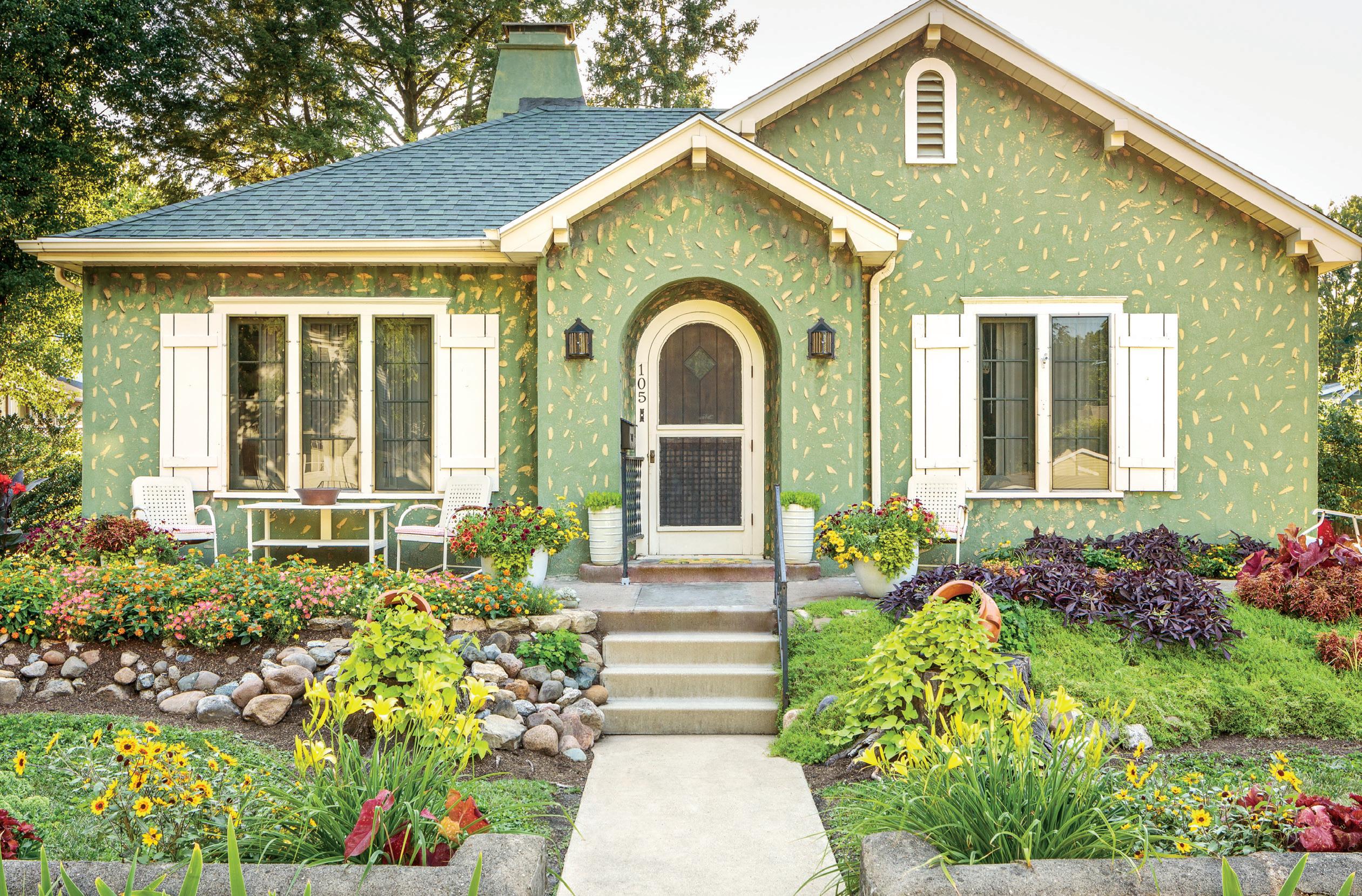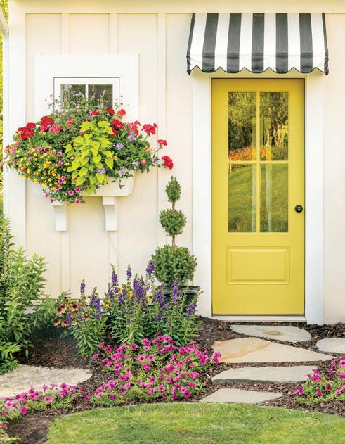Up your curb appeal with window boxes overflowing with flowering annuals and a bright chartreuse front door.