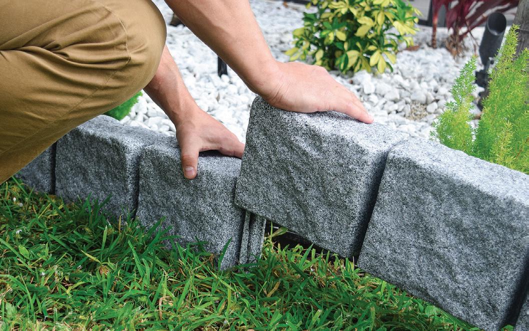 Beuta landscape edging looks like real Belgian block stone but is a lot easier to install. Simply, layout. Slide to connect, then hammer landscape spikes into pre-drilled holes to secure.