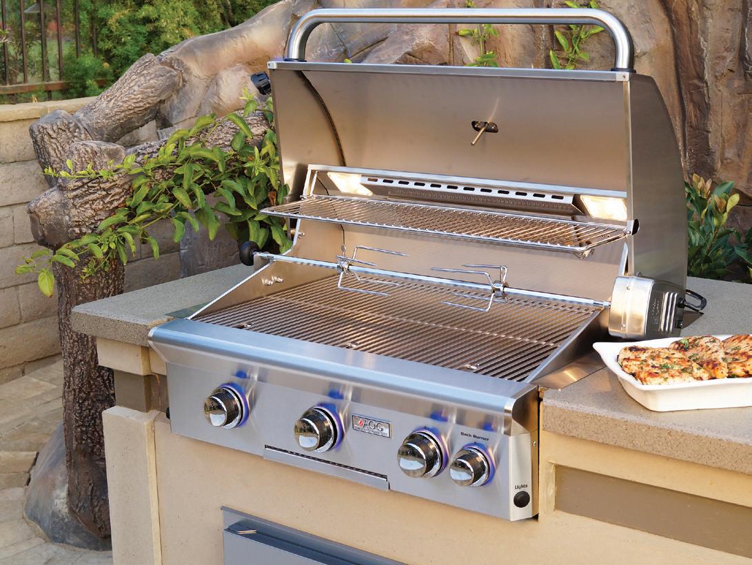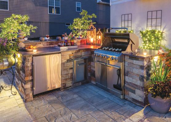 The masonry cook station (above left), with its Lynx professional grill, works equally well for weeknight grilling for two as it does when you are entertaining for many. The stainlesssteel, built-in cooler, trash & recycling drawer and storage cabinet add to the functionality of the outdoor kitchen.