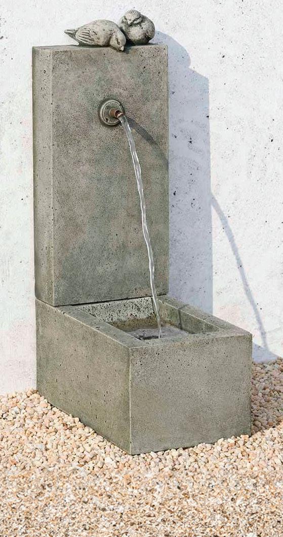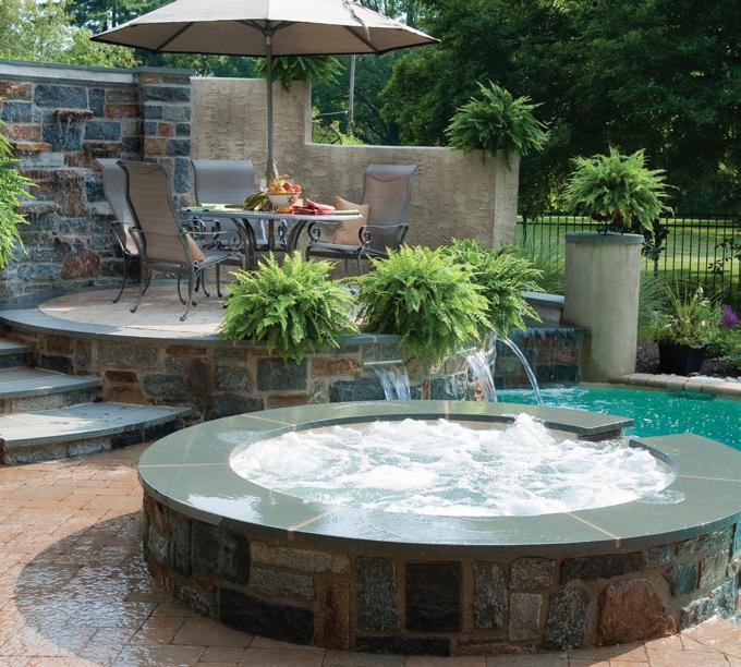 C Relax in the spa or dine immersed on all sides by water and greenery! Water flows down a stepped stone wall, behind the bluestone dining platform, and then into the pool via three sheer descents water features