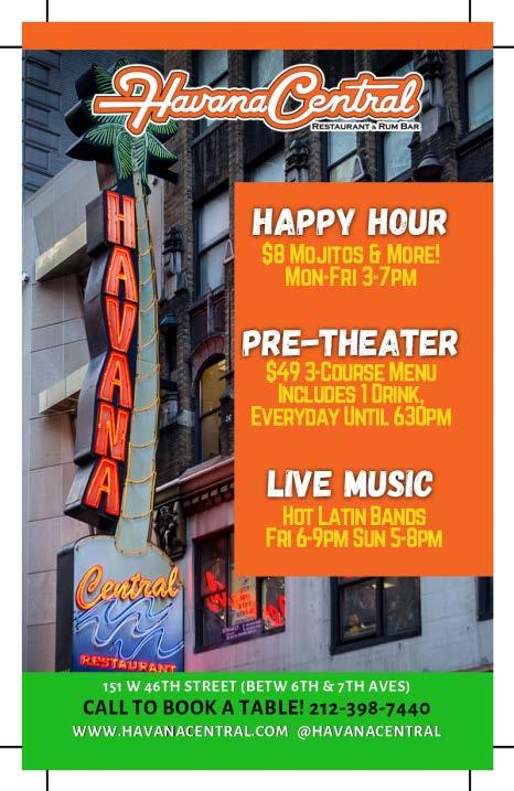 Nearby Havana Central serves home-cooked Cuban food in a lively setting. Fuel up with their festive Happy Hour, which includes halfprice empanadas and classic margaritas and mojitos. (Speaking of mojitos, the newest offer here is a Mega Mojito, NYC’s largest, packing five mojitos into a single super-sized glass.) Don’t miss live Latin beats, with bands performing Friday nights from 6-9pm and