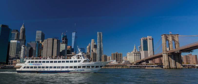 vibrant parts of city life. The views back to skylines and landmarks are even more impressive. City Cruises offers great ways to dine along the skyline. For a refined expe rience, book a Premier Brunch, Lunch, or Dinner Cruise on the all-glass, European-inspired Bateaux New York and enjoy chef-prepared, plated dining, live entertainment, signature cocktails, and the city’s most impressive views. Or enjoy an upbeat buffet experience with DJ music and views from the open air roof deck on the Spirit of New York.