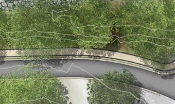 1.6.1 Pedestrian Plaza and River Overlook. Develop a pedestrian plaza and overlook to create a vibrant public space that celebrates local heritage by repurposing the existing remnants of the historic gateway and bridge.