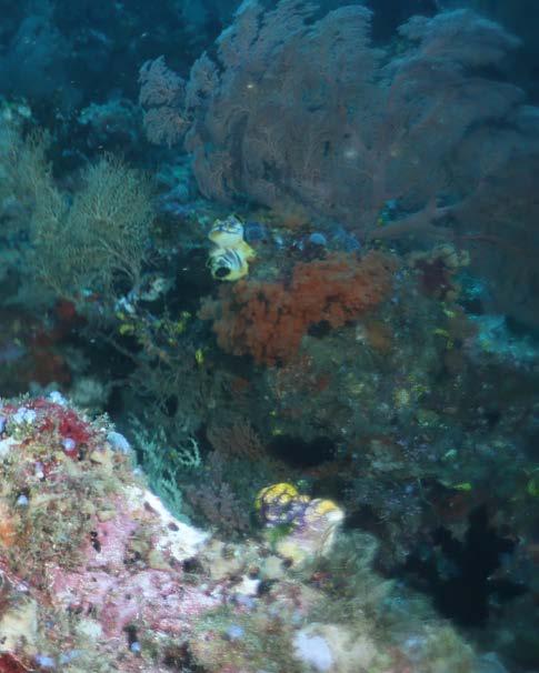 We continue our underwater journey, and we observe large gorgonians, with butterfly fish resting on their bases and crinolines hanging from their fins.