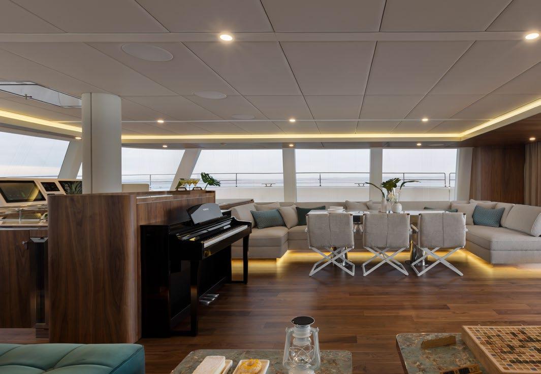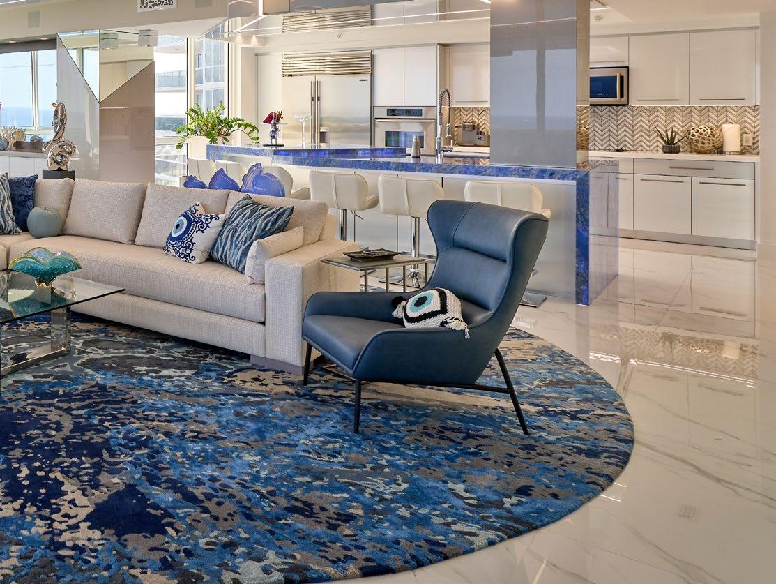 El diseñador establece la principal zona funcional de la propiedad en un patio hundido donde áreas espejadas vastas como el cielo y los lagos proporcionan una gran profundidad de campo, separando todo el interior de la propiedad de las complejidades del mundo exterior. La zona del salón frente a la barra de libros interpreta la convergencia del tiempo con formas geométricas.