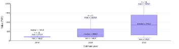 Fig 1 : Global data center energy estimates for 2010, 2020, and 2030 in TWh. There is a wide range of estimates, which expands as forecasters look further into the future. The whiskers indicate the minimum and maximum values. Five estimates between 2,000 TWh and 8,253 were omitted to allow for scaling. (Mytton and Ashtine)