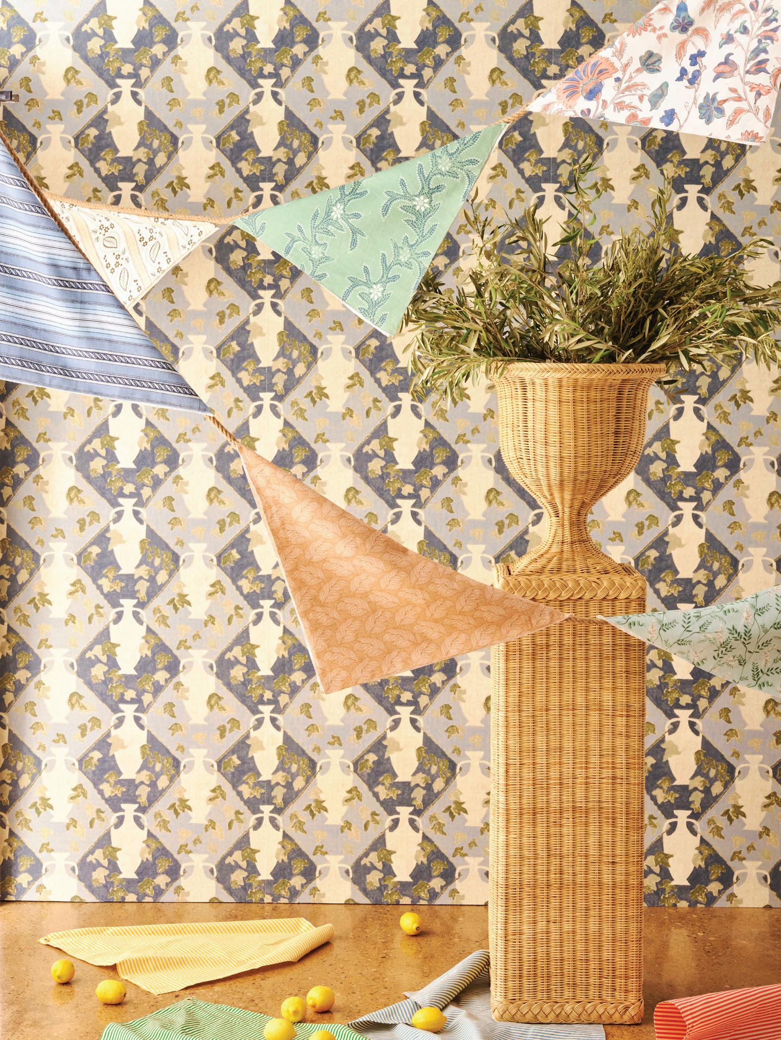 opposite page: (from left) Davis kept things calm and cool in the primary bedroom with a blue velvet sofa and rattan Serena & Lily bench with a cushion covered in Alexis Walter fabric. The floral-print bolster adds a pop of pattern to the white bedding but doesn’t overwhelm. The vase on the nightstand is from Blue Print. Lulie Wallace wallpaper and a scalloped rug from Lindsey Meyer Art + Design Co. give a sweet feel to the twins’ bathroom.