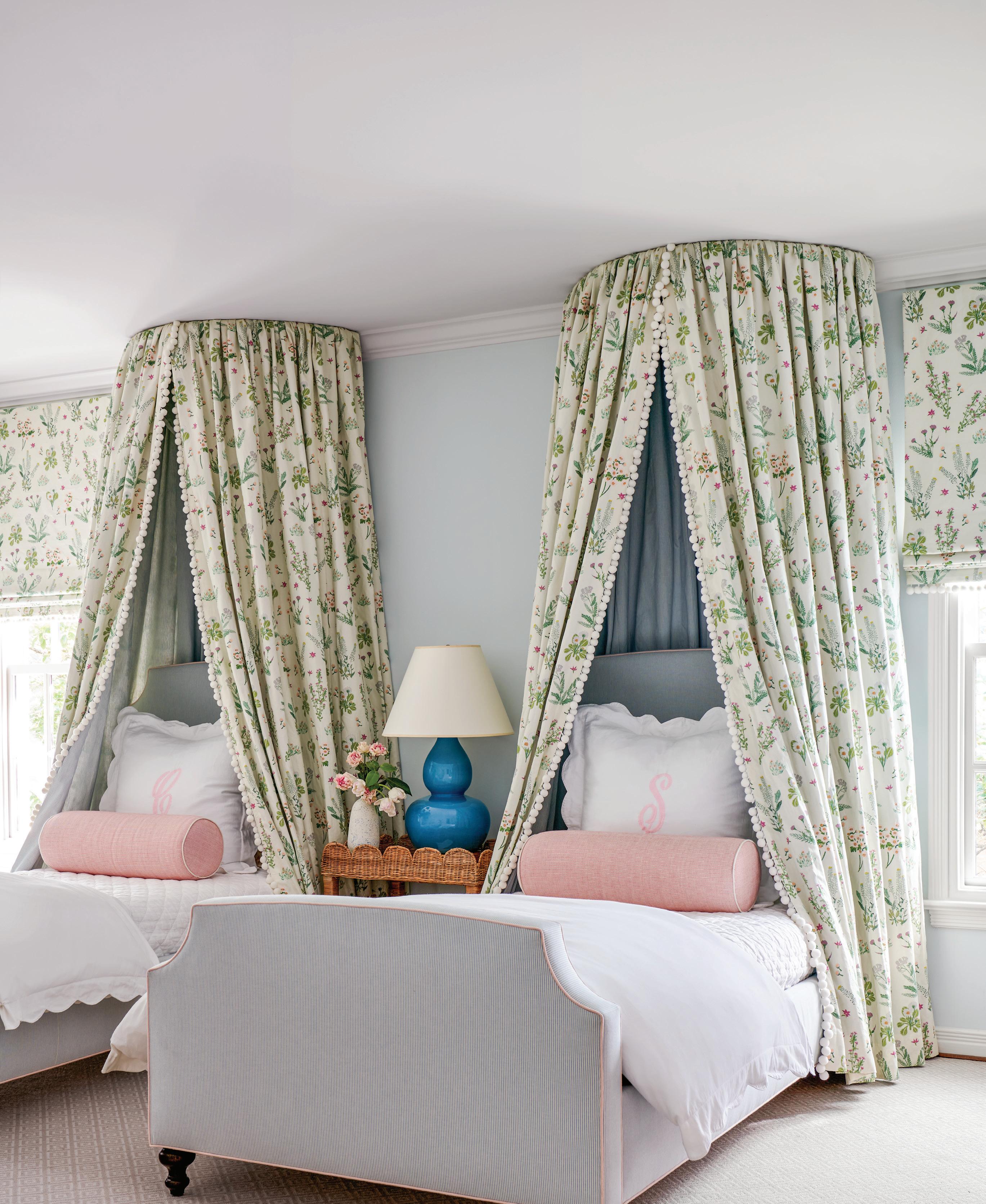 this page: Because the twin daughters were going to be sharing a room, Catherine wanted their space to be extra special. The custom canopy beds with pompom-trimmed Lulie Wallace fabric did the trick. “Seeing two little girls run in and scream with excitement was pretty special,” Davis says. “That’s a favorite design moment that I’ll never forget.” The scalloped side table is from Serena & Lily, and the vase perched atop is from Blue Print.