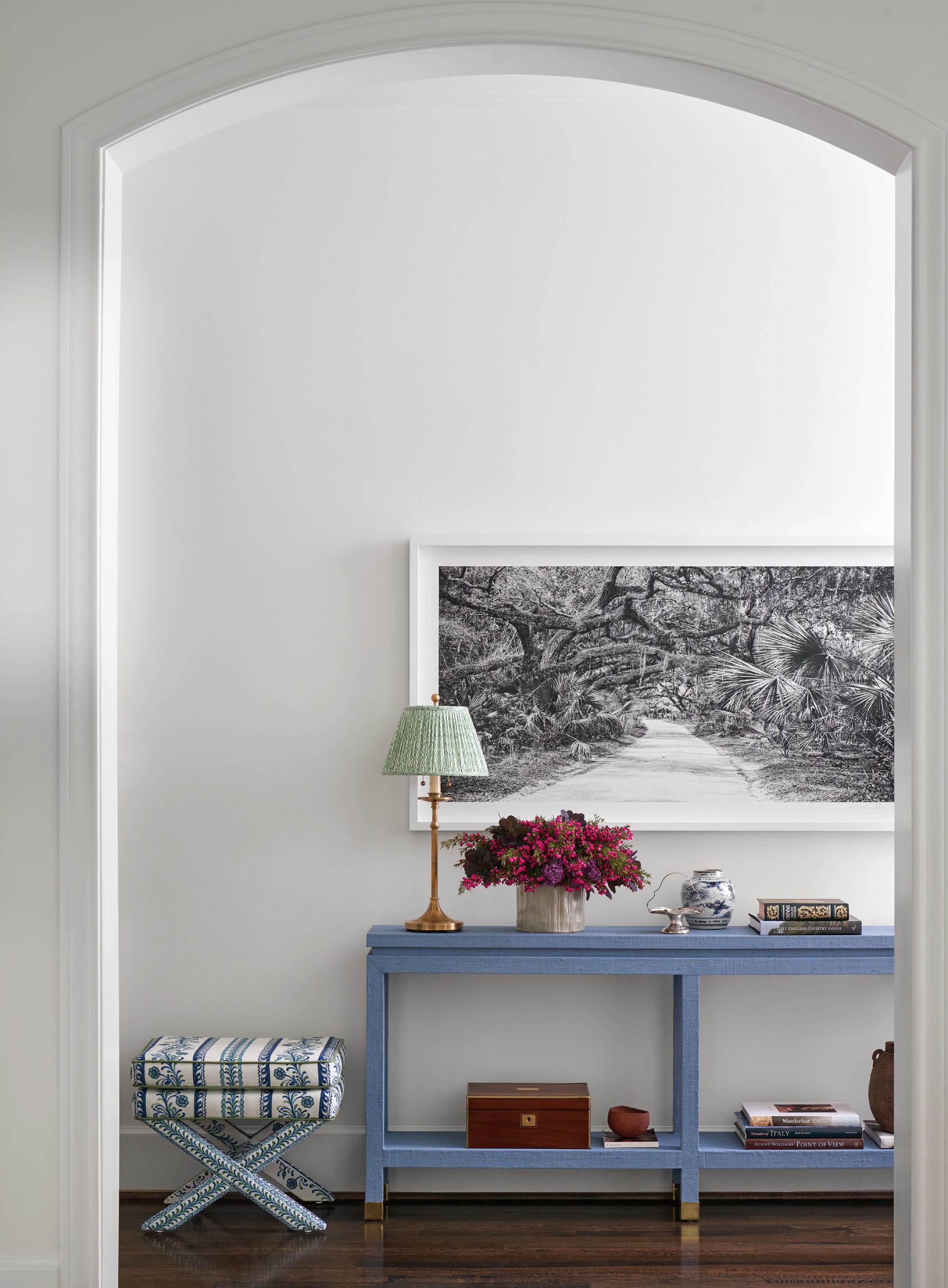 door to back, east side to west, the house delights at every turn, whether it’s whimsical floral wallpaper livening up a formal dining space, a splash of bright green paint in a laundry room, bullion fringe trim on an otherwise simple sofa in the front sitting room, or a custom baby-blue sideboard—painted in Farrow & Ball “Parma Gray”—adding a pop of color to a mostly white kitchen. Even better, the home is 100 percent kid-friendly. With four little girls living in the house—Bessie, 8; twins Suzie and Callie, 6; and Ginnie, 2 1/2—(plus a dog and a cat!) every space needed to be able to withstand the daily wear and tear brought on by a big family, because, as Catherine notes, the McWilliams clan “lives in every inch of the house.” To help the cause, Davis used performance fabrics throughout and made sure every piece of furniture was a comfy, welcoming spot for Mom, Dad, kid, or pet. She also worked with contractor Janice Crawford to create the home’s most trans-