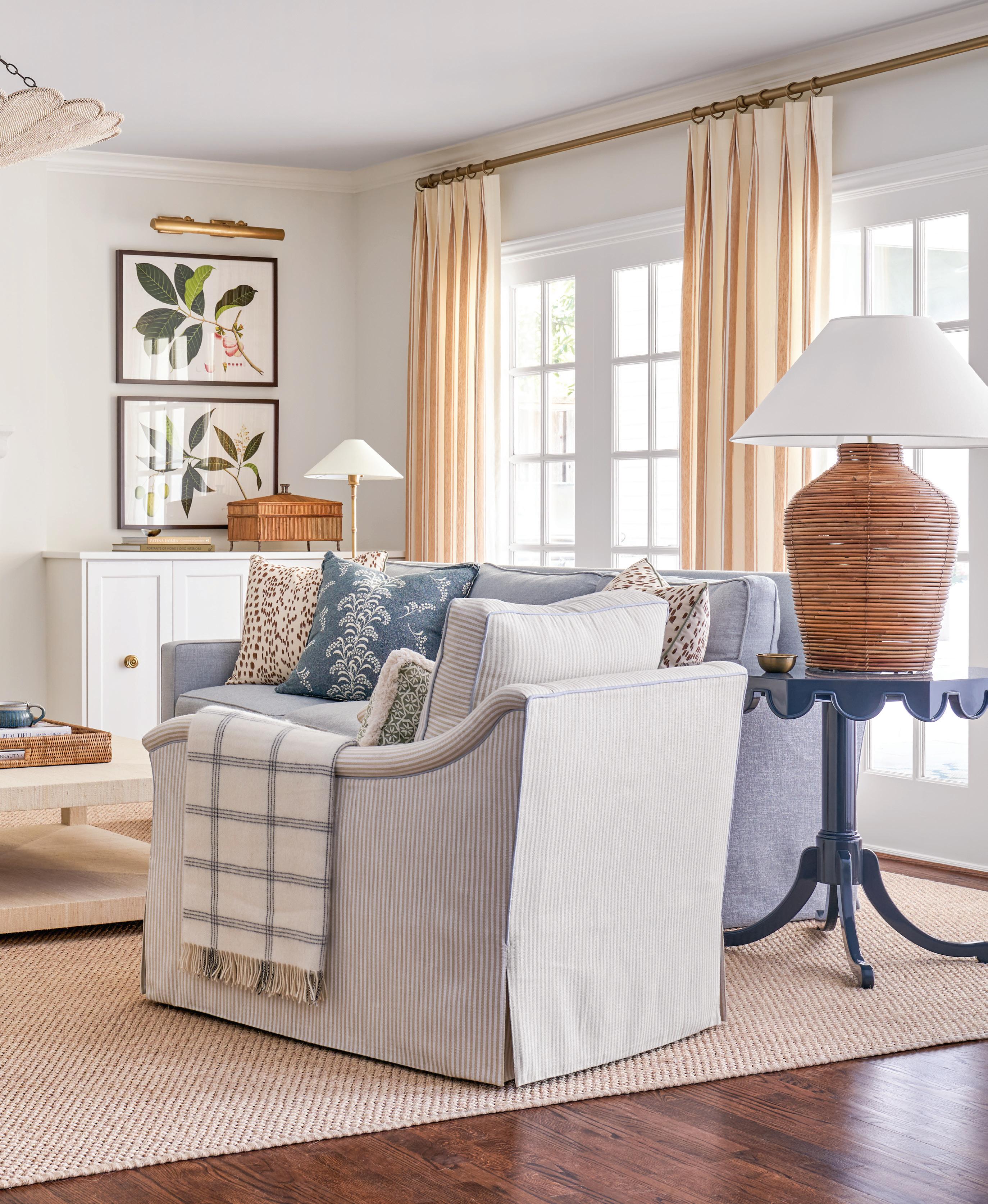 Davis’ overall goal for the formal sitting room was to make it dressier than the family room but still feel like a place where lounging is welcome and encouraged. A Schumacher sisal wallcovering, an antique rug, and millwork painted in Benjamin Moore “Lead Gray” up the coziness factor, while eye-catching custom drapes made from Jasper Collection fabric add punch. The fringe trim on the custom sofa brings a bit of whimsy. “I always love a little pop of extra,” Davis says. The bowl on the drink table is from Blue Print.