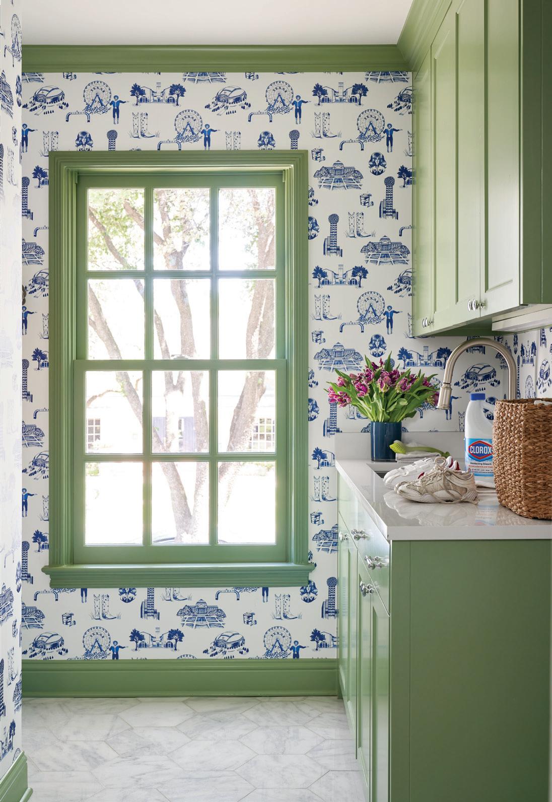 this page: (from top) From the darling bow chairs to the sweet Lulie Wallace fabric on the Roman shade and bench seat, the playroom is the stuff of every little girl’s dreams. Even the bulletin board has girlish flair: “The builder made that for us and painted it pink; then we added trim from Fleur,” Davis says. The play table is actually a coffee table from Serena & Lily, the Stark antelope rug came from the McWilliamses’ previous home, the ceiling fixture is by Coleen & Company, and the bowl is from Blue Print. The laundry room pays homage to the home’s locale with Katie Kime’s Big D–themed “Dallas” toile wallpaper. The millwork is painted Sherwin-Williams “Rookwood Jade.”
