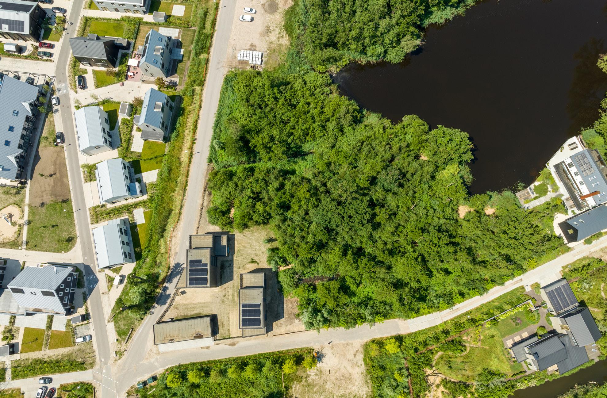 Midden in het Kruitbos zijn twee unieke villa’s gerealiseerd. Geïnspireerd op een Scandinavische bouwstijl en volledig verweven met het landschap rondom. Kenmerkend voor deze eigenzinnige villa’s is onder meer de gedeelde kapschuur. De erfafscheiding wordt gevormd door een karakteristiek houten hekwerk langs het wandelpad. Beide villa’s hebben een eigen plek aan het water.