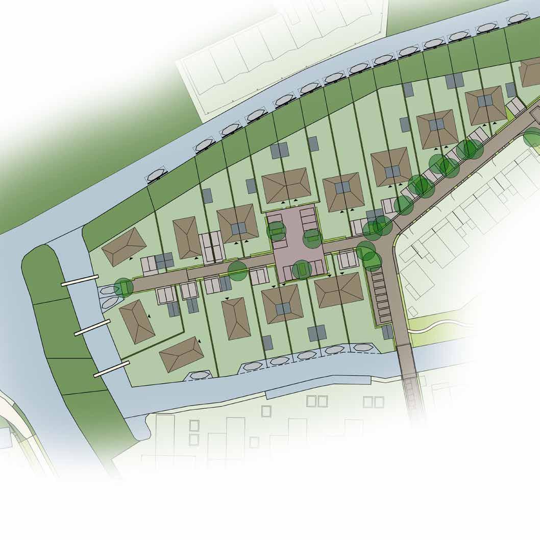 • De andere woningen hebben een aanlegplaats aan de tuin langs de Kruitvaart (bekijk ook de afbeelding op pagina 7 als referentie).