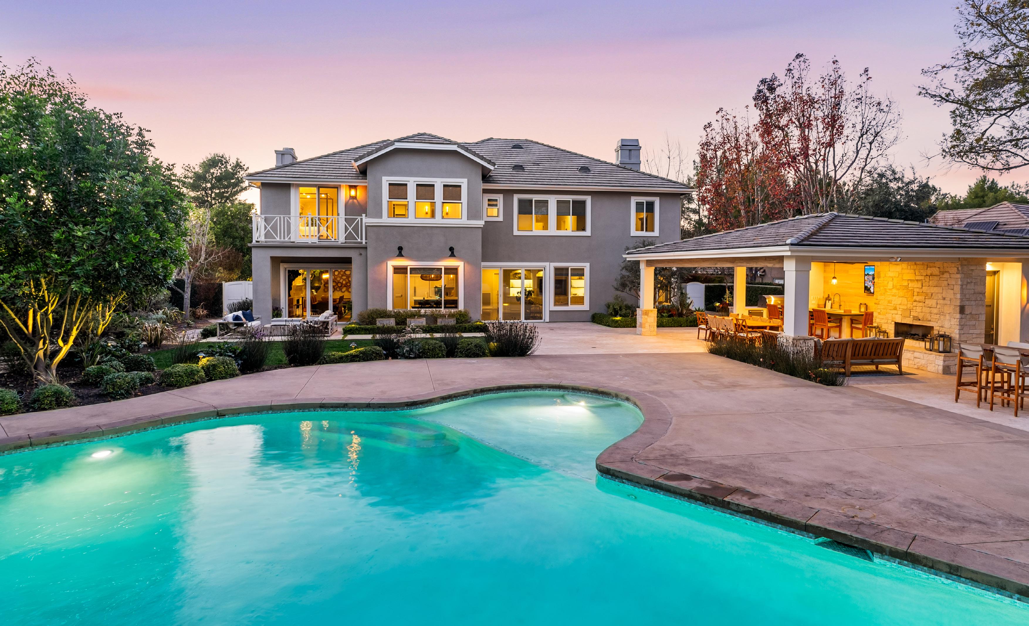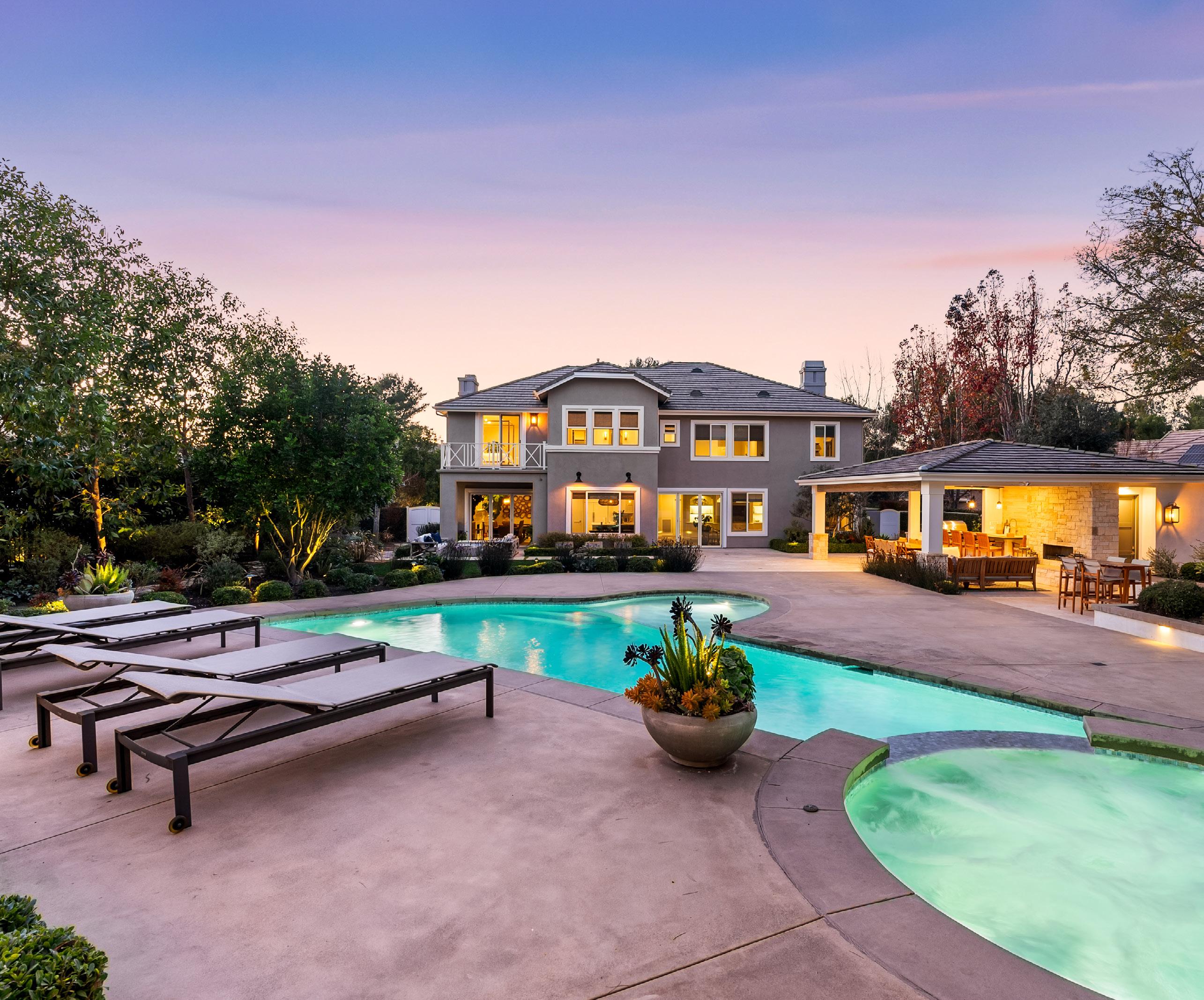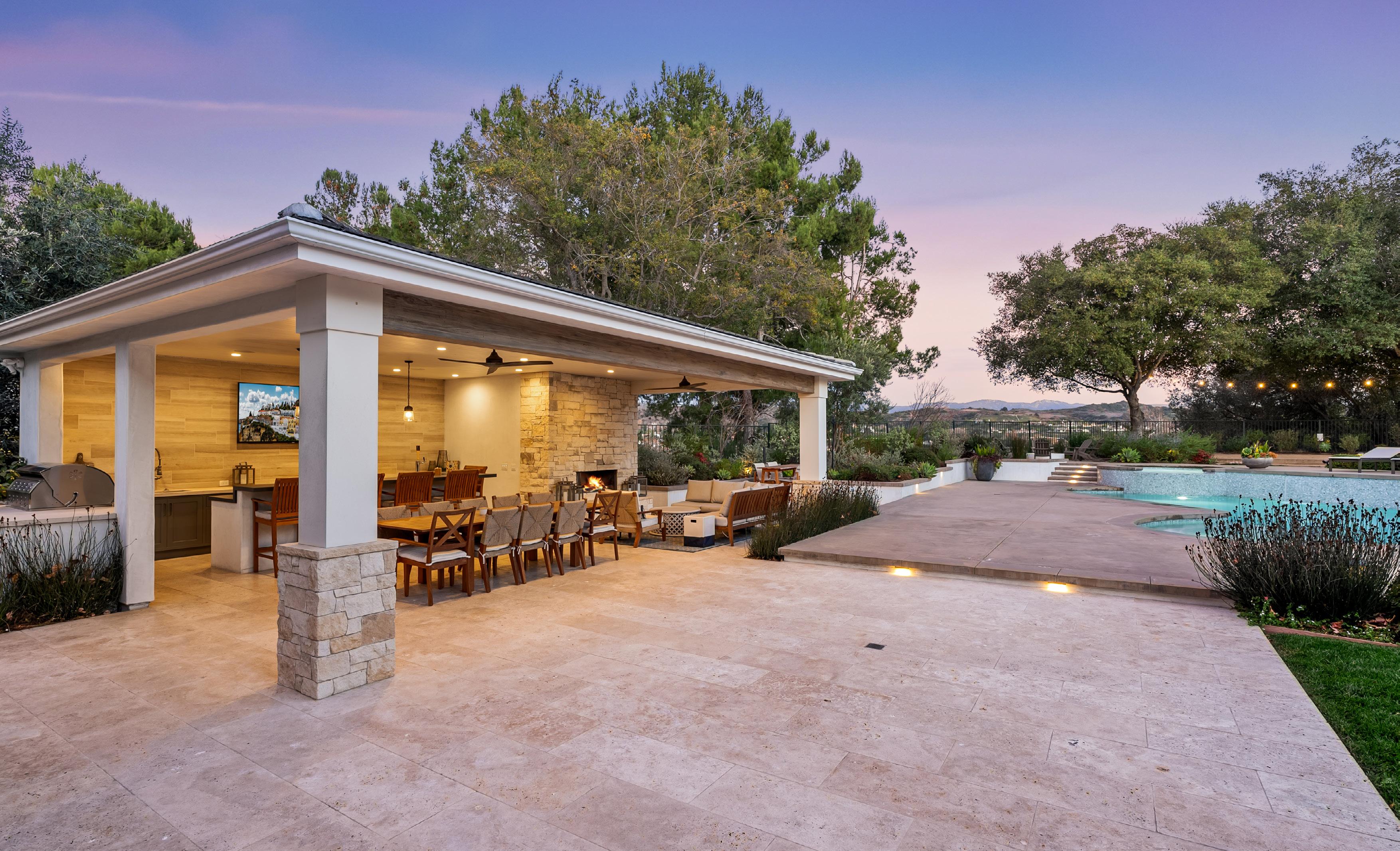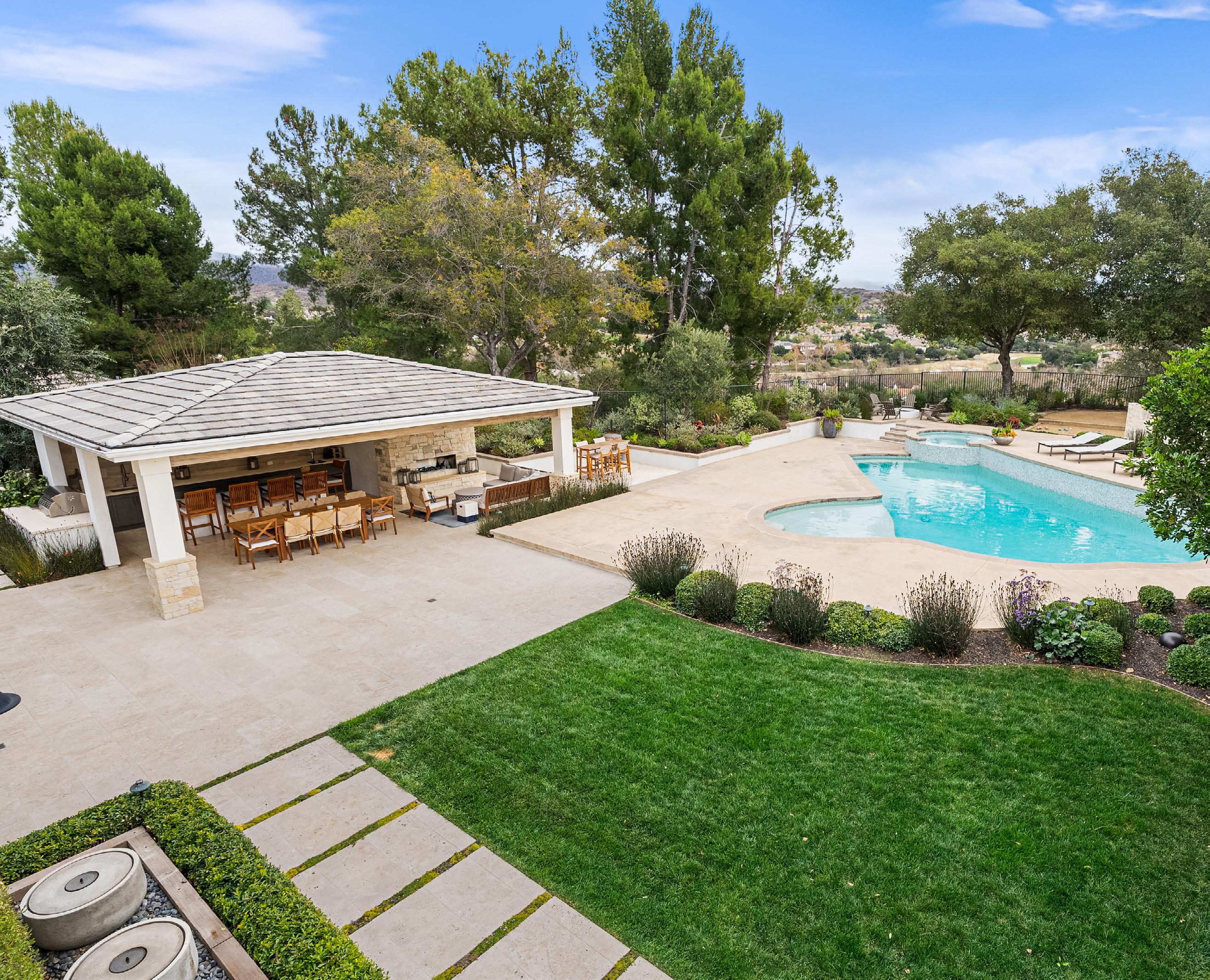 This custom residence, set on a 26,078-square-foot lot, combines sophistication and modern elegance with a layout designed for entertaining. A long paver driveway leads to a nearly 4,500-square-foot French-inspired home that seamlessly blends indoor-outdoor living. The grand two-story foyer and elegant formal spaces, including a living room with a fireplace and a dining room with La Cantina folding doors to the backyard, create a stunning first impression. The family room and chef’s kitchen flow together for casual gatherings, with folding doors opening to the outdoor living area. The kitchen features a large island, marble countertops, glass cabinetry, and premium appliances. Five spacious bedrooms and four-and-one-half baths include a luxurious main-level ensuite and a primary suite with a private balcony, fireplace, and spa-inspired bathroom. A bonus room upstairs offers additional space for entertainment. The backyard is a resort-style oasis, with a pool, spa, heated casita with a stone fireplace, bar seating, and a built-in grill. Smart-home technology controls lighting, audio, and the pool. A four-car garage with fitness space and storage completes the home. Enjoy top amenities like golf, trails, and tennis courts nearby in Coto de Caza.