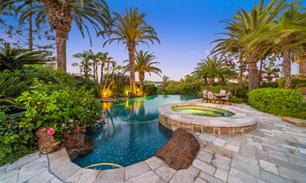 • Infinity pool, spa, sunken stone fire pit, stream, trellis walkway covered in grape vines, waterfalls, flowers, fruit trees, vegetable garden, lawn area, pathways