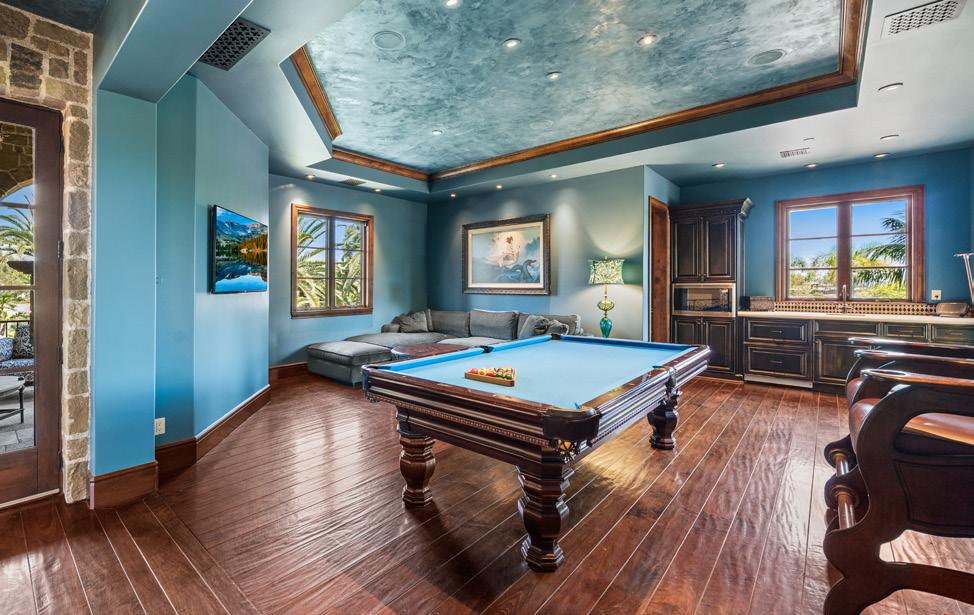 Hidden behind a stone façade and private gates in Camarillo’s prestigious Las Posas Estates, 427 La Marina Drive is a one-of-a-kind Italian Villa that fuses the romance of Old World craftsmanship with the sophistication of modern design. Every element, from the imported finishes to the thoughtfully designed living spaces, reflects a standard of luxury that is both timeless and uncompromising. Built in 2008 and meticulously maintained to the highest standards, the residence spans over 9,200 square feet of living space on more than 1.05 acres of private, landscaped grounds. With six bedroom suites and nine baths, the layout offers flexibility and elegance that is seamlessly connected by an elevator. A detached guest casita with its own bedroom and bath, and a fully self-contained guest cottage with a complete kitchen, washer/dryer, living/dining areas, and private suite with bath, perfect for hosting with ease and privacy. Inside, the home’s grandeur is immediately apparent. Venetian plaster walls, imported limestone, Crema Marfil marble, custom cabinetry, and custom inlaid Versailles hardwood flooring set a tone of refined luxury. The great room soars with beamed ceilings and a dramatic stone fireplace, while the formal dining room with its paneled barrel wood ceiling opening to a serene courtyard. Five balconies and a collection of courtyards with flowing fountains create a harmonious blend of intimate retreats and refined spaces for connection.
