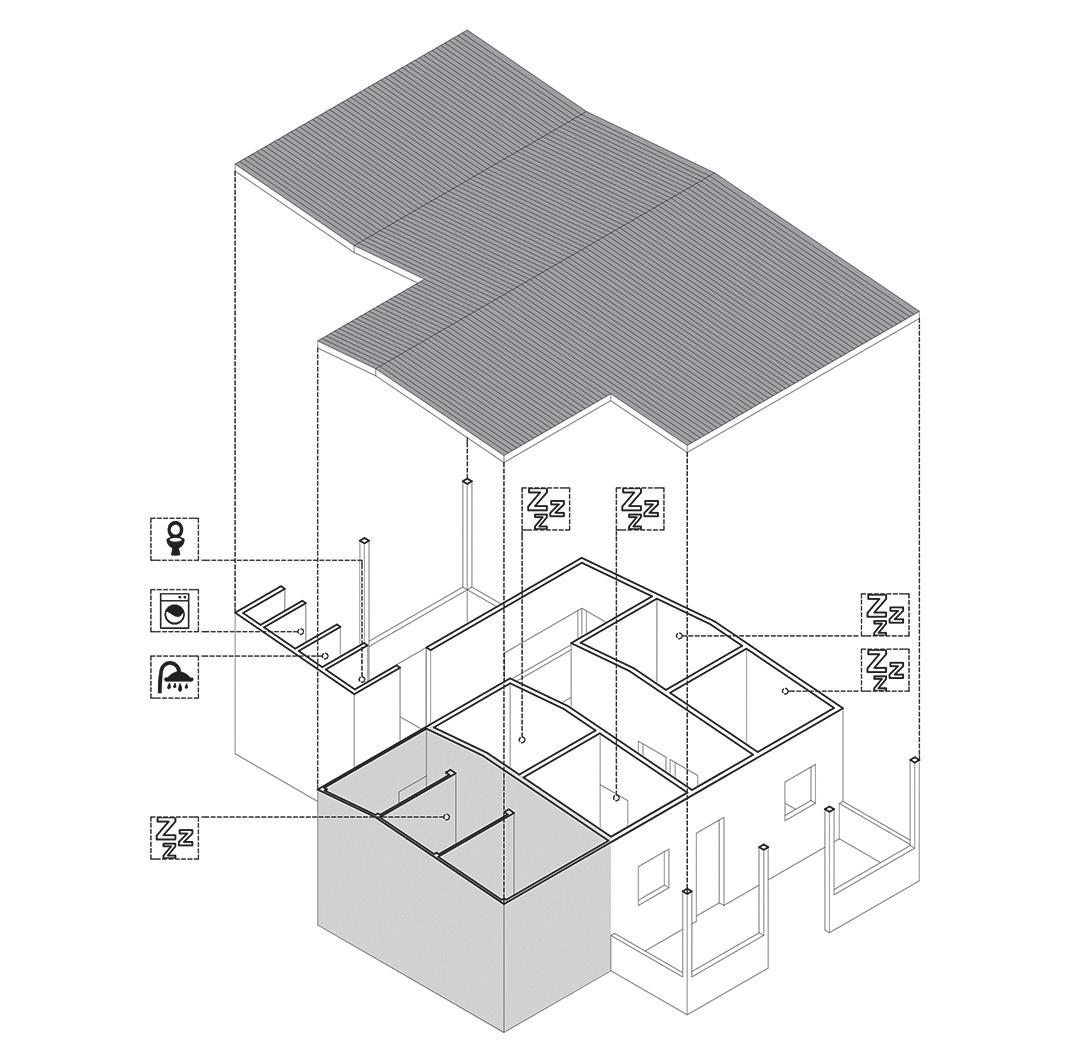 "Después de varios intentos de agrupación de las viviendas en un único edificio y de escuchar a los futuros usuarios, se optó por pequeñas construcciones aisladas de tipología muy definida, con antecedentes en el carro gitano, el hórreo y el vagón de literas, lo que dio como imagen resultante la de un campamento gitano integrado por carros que también recuerda, por el tipo de asentamiento sobre una topografía accidentada, a un campo de hórreos. Las viviendas, de pequeña superficie y bajísimo costo, debían albergar familias numerosas de entre siete y trece miembros cada una, lo cual aconsejaba una disposición de dormitorios y camas análoga a la de un vagón de literas."17
