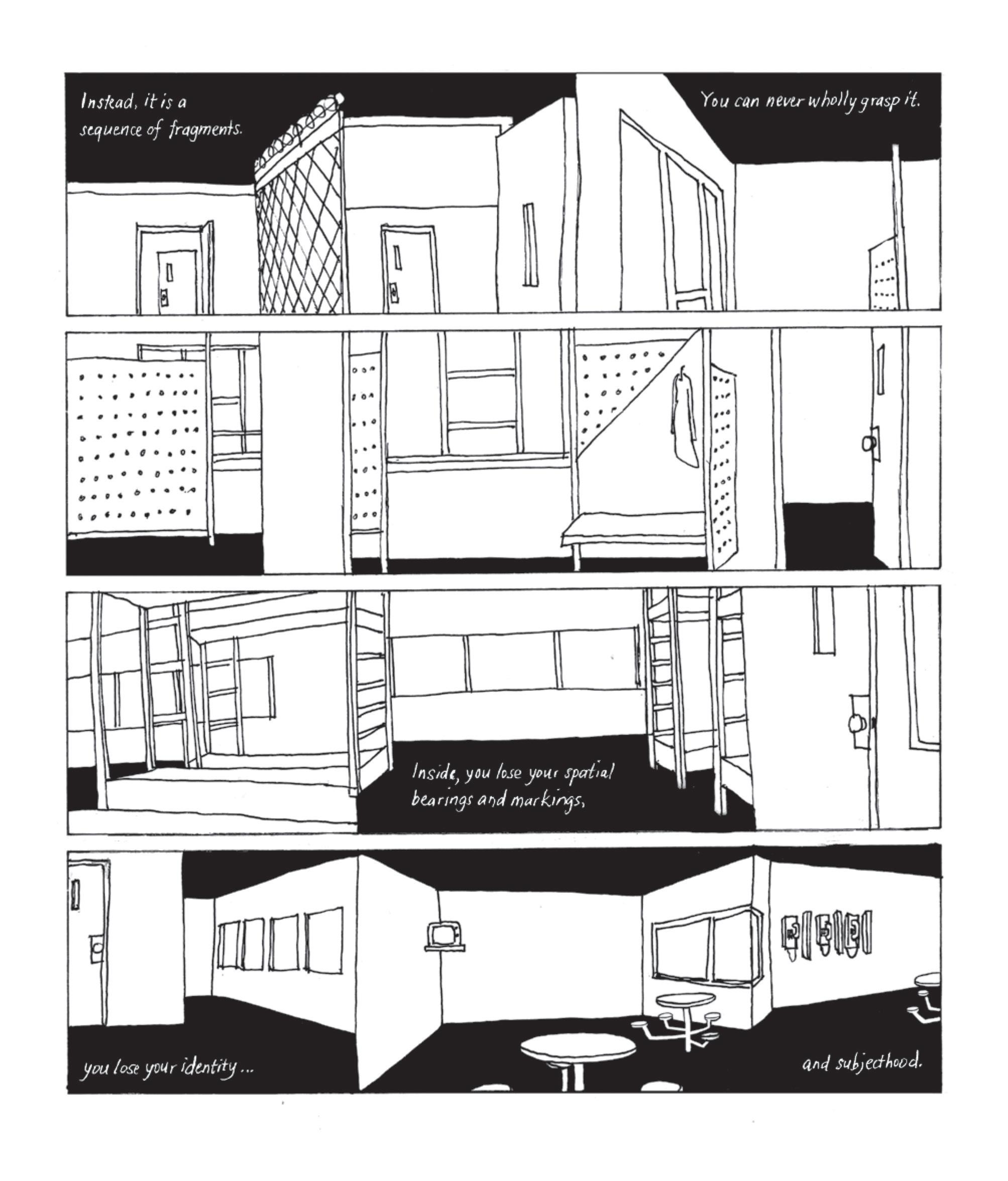 Notemos, además, cómo el modelo de campo propuesto por Agamben para pensar las relaciones de poder conlleva cierta dimensión urbana más allá de la lógica arquitectónica del edificio, que se podía vislumbrar en la propuesta disciplinaria de Michel Foucault.6 Si para ilustrar una cierta disciplina del espacio que surge en el siglo XVIII Foucault proponía como modelo de las relaciones de poder el espacio panóptico de Jeremy Benthan, en el que, debido a la disposición espacial, cada usuario se convertía en vigilante de sí mismo —modelo que aparece en cárceles, escuelas, fábricas y en todas las arquitecturas institucionales surgidas en el siglo XVIII—, el modelo de campo de Agamben incorpora la dimensión urbana: los diversos elementos arquitectónicos o pabellones incluyen “calles” y “equipamientos”, y cierta variedad de usos que propicia el desarrollo de la vida en su totalidad, y que, por lo tanto, requieren otro tipo de cercamiento. Si la vida puede desarrollarse completamente dentro del campo, y no solo de una parte de ella —como puede ser reformarse, estudiar o trabajar—, entonces lo que se pretende establecer es un control absoluto de todas las facetas de la vida, incluyendo el desplazamiento entre ellas.