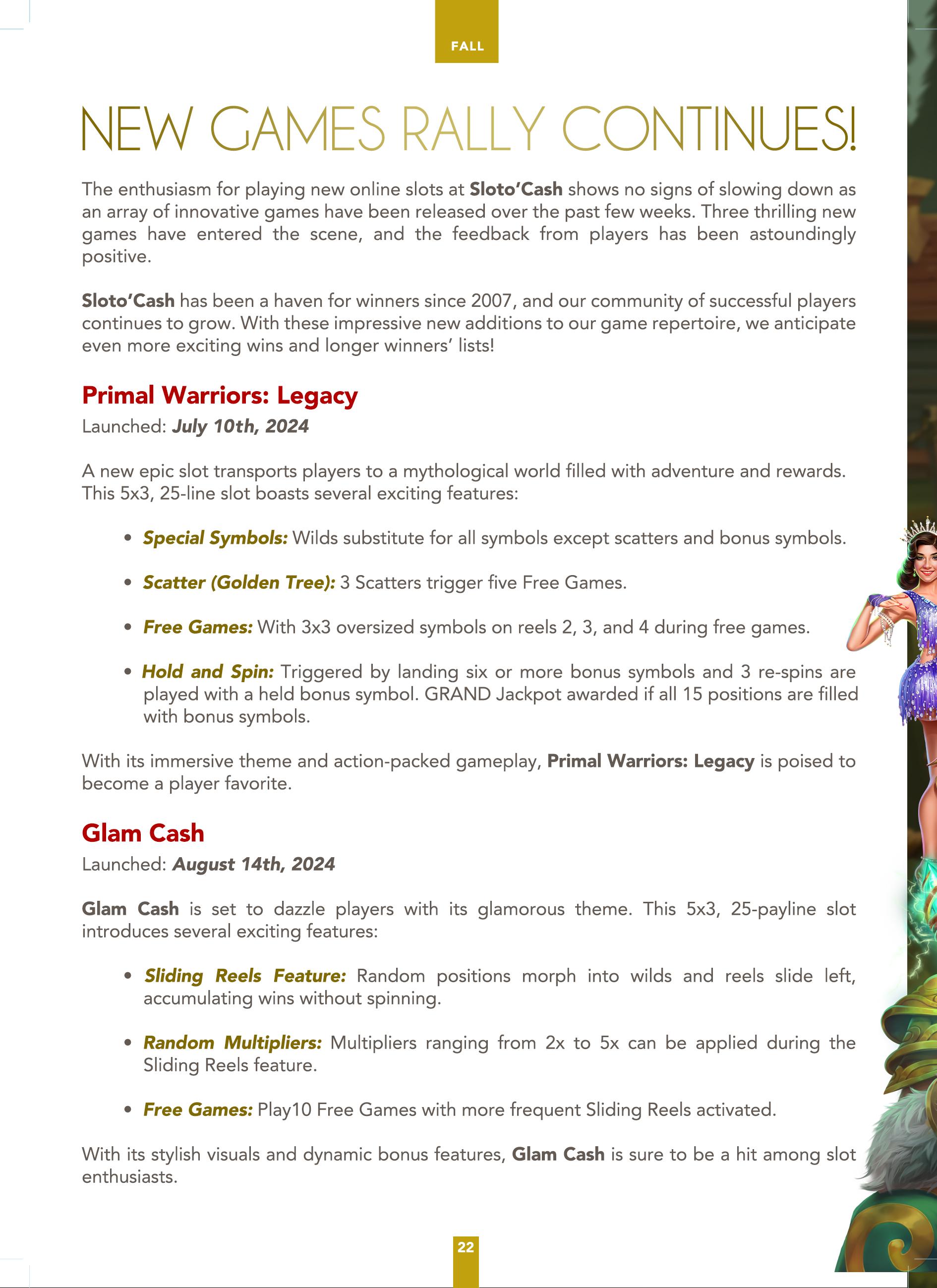 Sloto'Cash continues with an exciting lineup of new slots! Spin the reels on Glam Cash, Bass Baggin’, Primal Warriors: Legacy, and many more. Each game offers unique themes and thrilling spins.