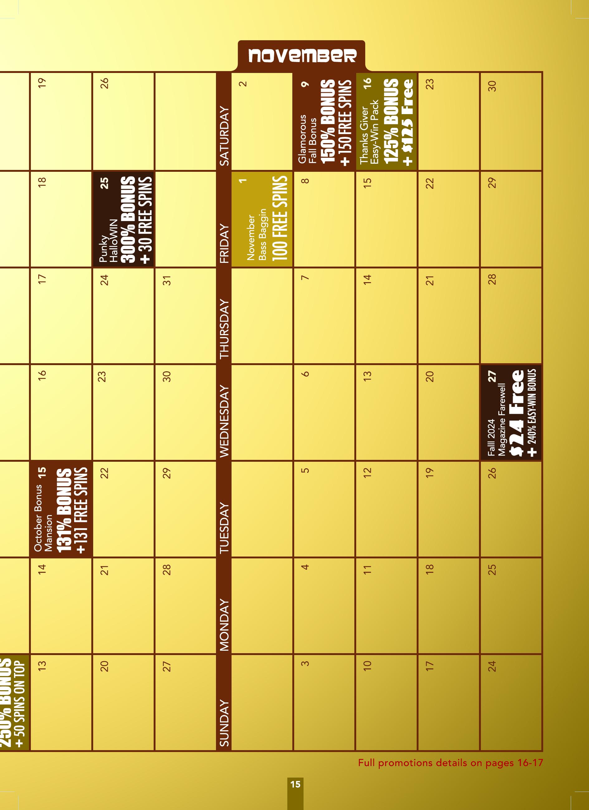 In the middle section of Sloto Magazine, you'll find a 3-month calendar full of exclusive coupons available on specific dates and events. Seize the opportunity to boost your winnings with our generous promotions!