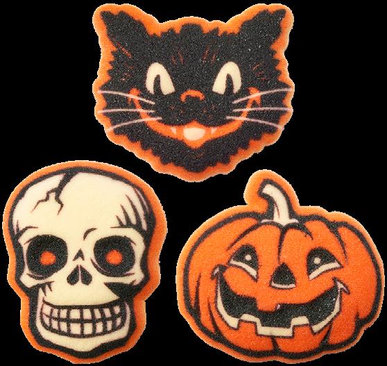 Shown: #29615 Skeleton Bones Dec-Ons®, #48785 Happy Jacks Assortment Dec-Ons®, #48626 Ghost Buddies Dec-Ons®, #38712 Happy Halloween Script DecoPics®, #29369 Black Shimmer Dust Edible Glitter, and #29375/29363 Silver Dust Edible Glitter