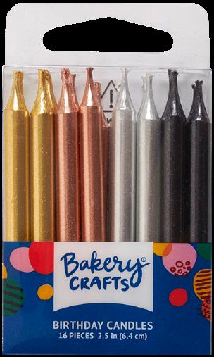 Shown on cover: 8” double layer round: #29534 Candelabra Vertical Layon, #29625 Metallic Skull Rings, #6190 White Glitter Smooth & Spiral Candles, and #29364/29376 Bright Gold Dust Edible Glitter