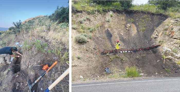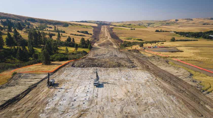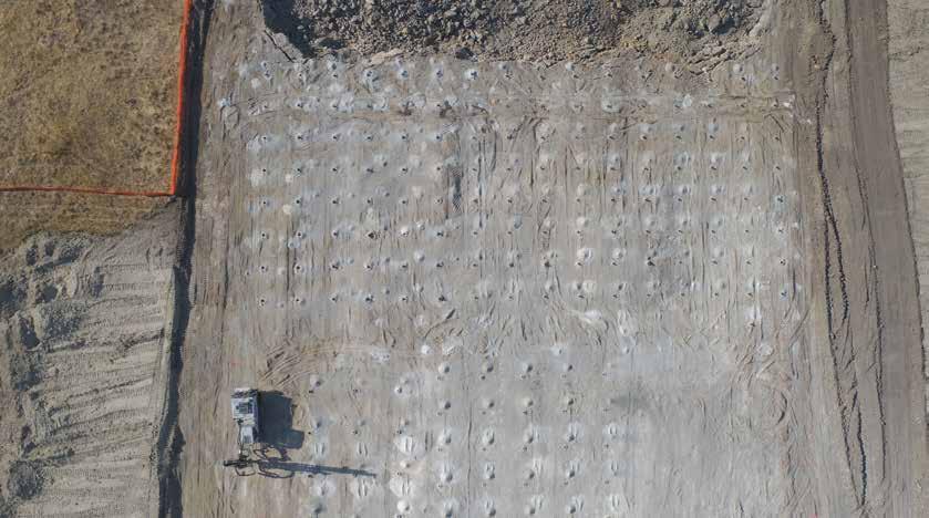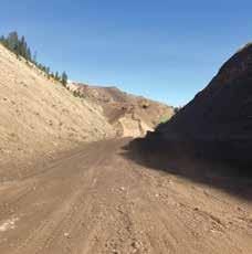 the project. Blast sizes were designed to utilize one, two, or three full 23,000-pound trucks of explosives, including required accessories such as blasting caps, boosters, delays, and lead lines. We also used a skid steer to transfer 1⁄2-3⁄4 clean gravel from delivery storage to the blast holes for back stemming loaded blast holes.