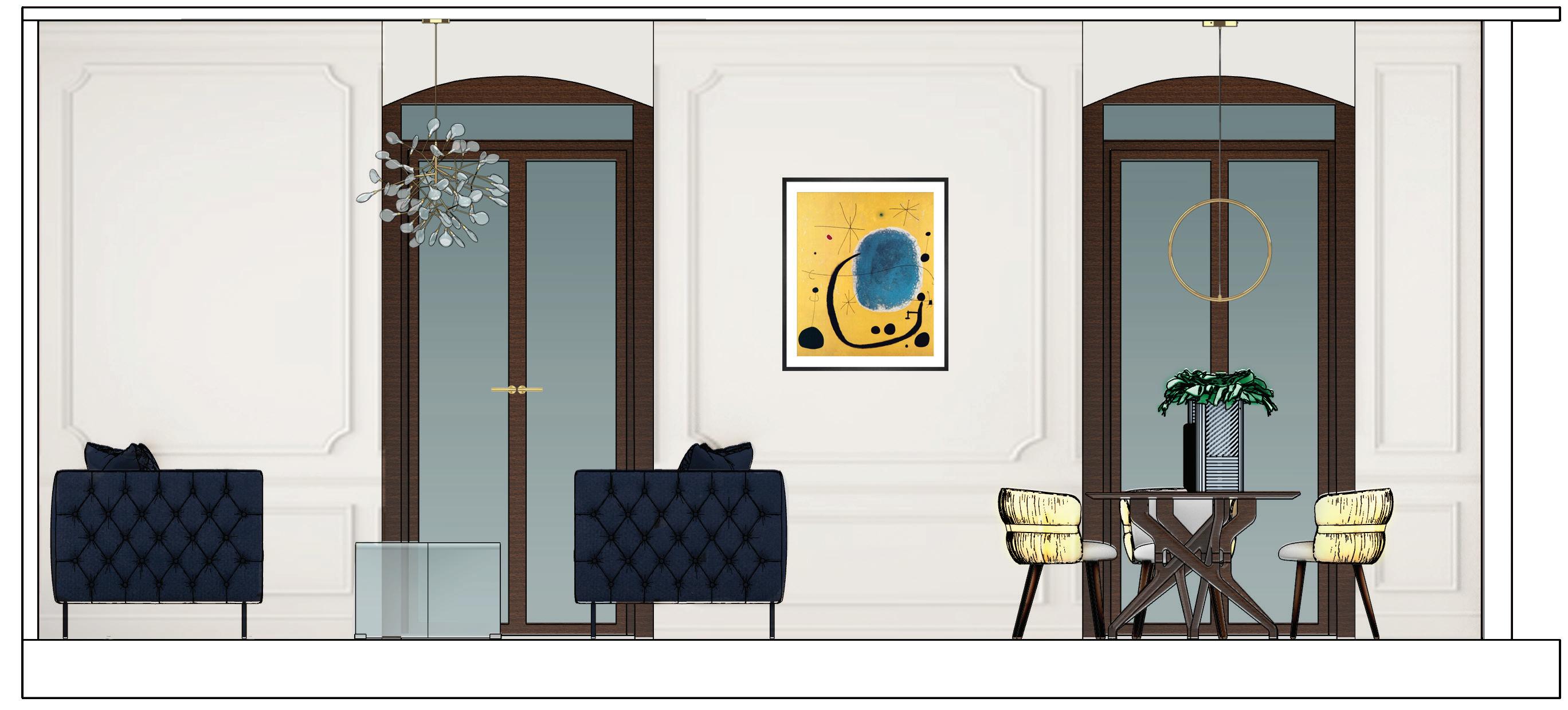 Eclectic style project, of a 31.84 m2 living room. The room has two large windows and two double doors. The furniture that I have chosen highlights the character of the place. Made with complementary contrasting colors in a harmonious way. Blue colors convey depth and comfort; while yellow colors bring luminosity and optimism, together with the gold color, that is associated with wealth.