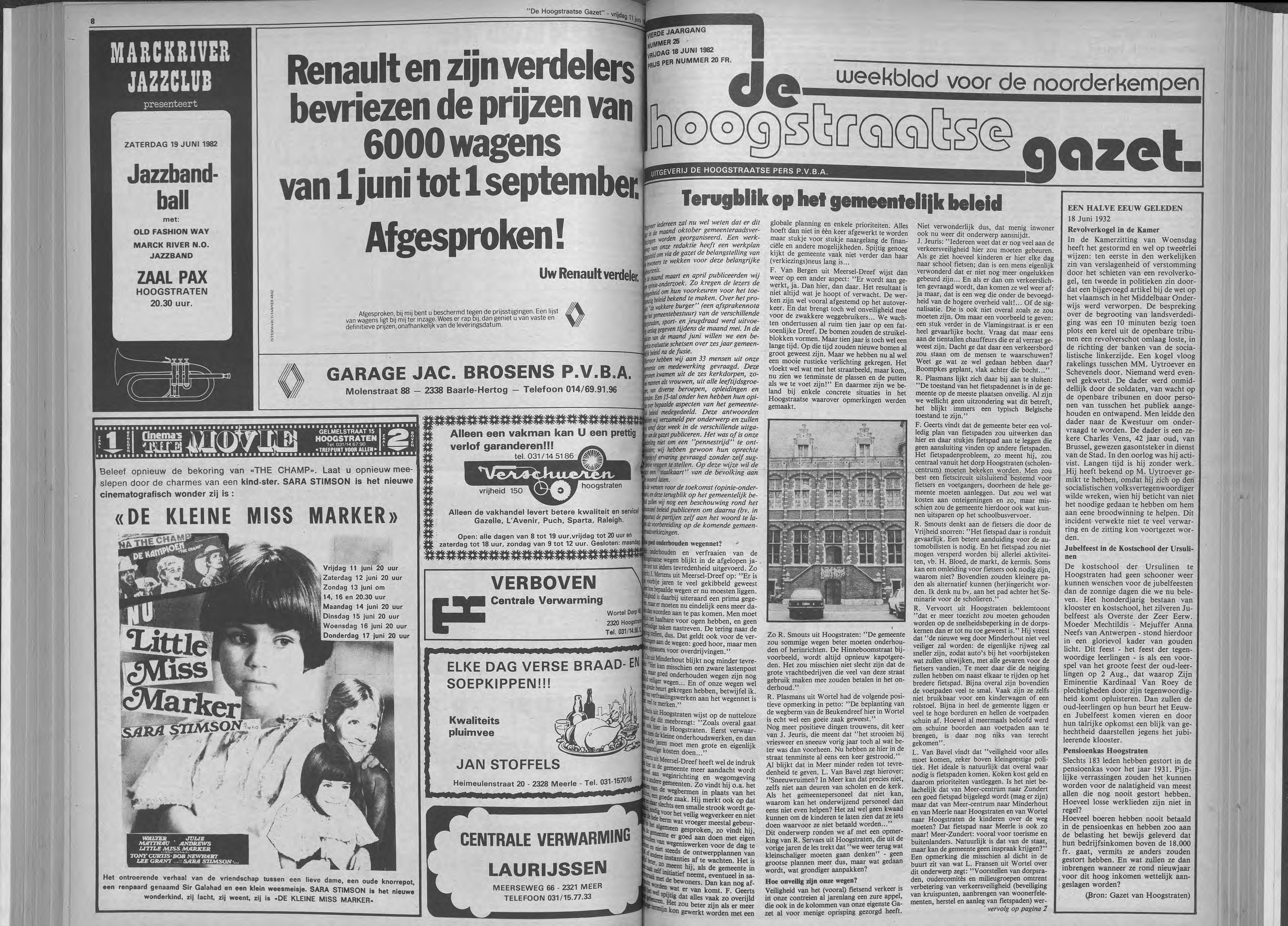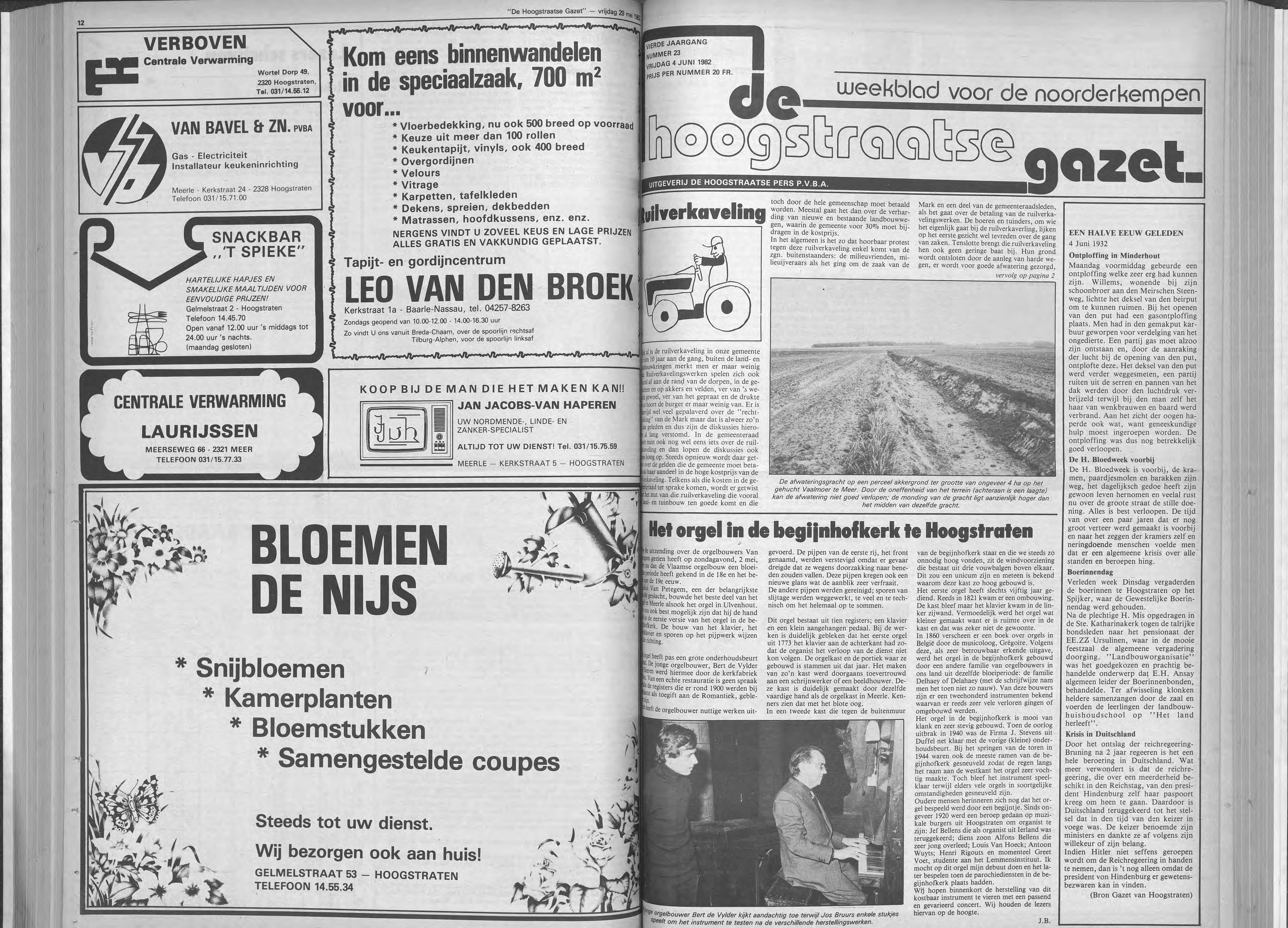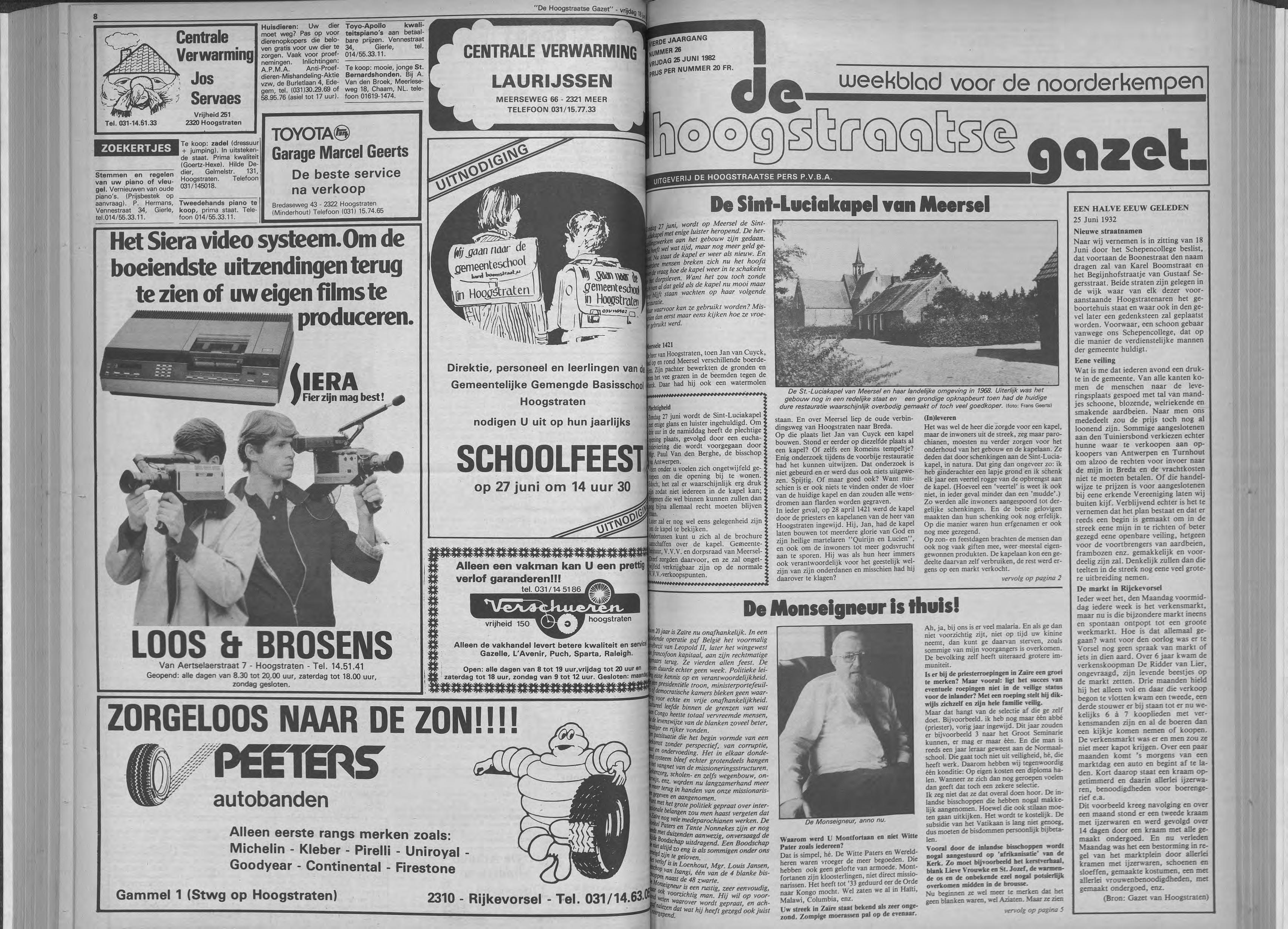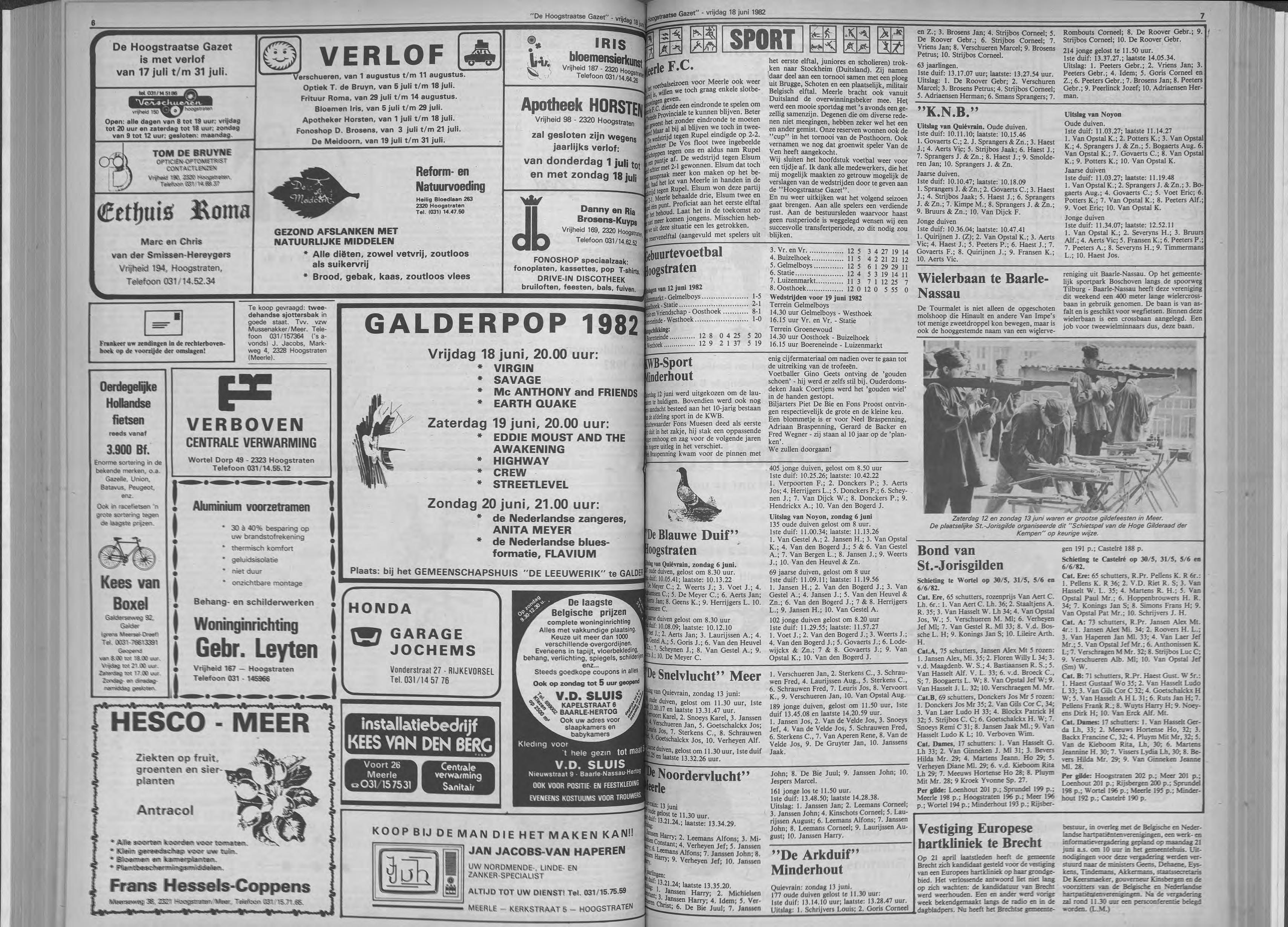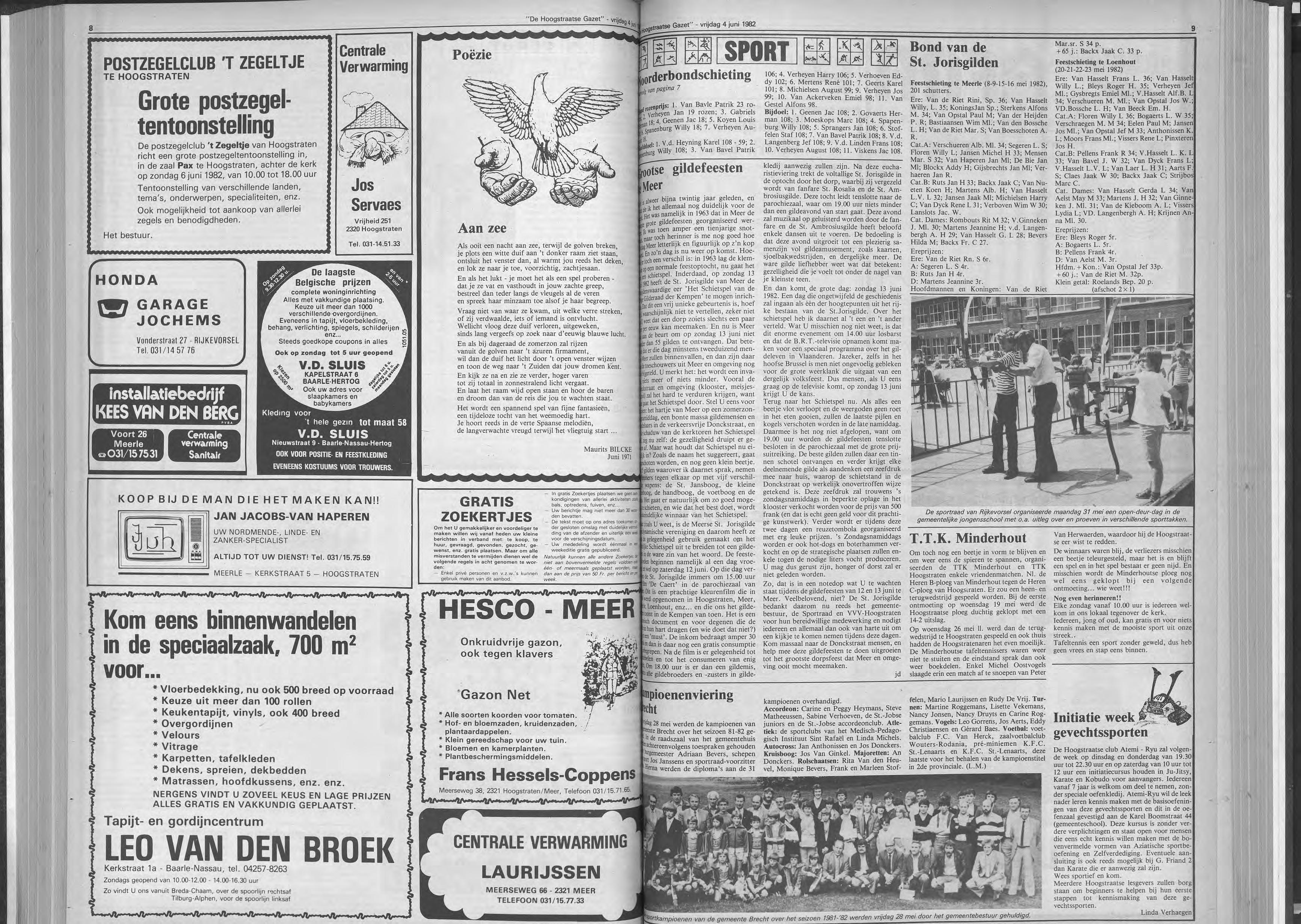 Galerie De Marckhoeve, Watermolenweg 2, Meersei Dreef T/m 13 juni keramiek van JACKIE BONGERS, bronsplastieken van HANS VAN EERD, etsen, lithografie, zeefdrukken en gemengde technieken van BIRGIT VAN BRACHT en oliepastels en tekeningen van JAN VAN DEN BROEK. ,Open: .op woensdag tim zondag van 13.30 tot 17.00 uur. _Zaal Pax, Hoogstraten Postzegelclub 't ZEGELTJE van Hoogstraten orgamseert een grote postzegeltentoonstelling op zondag 6 juni 1982 van 10 tot 18 uur. Er is mogelijkheid tot aankoop van zegels en benodigdheden.