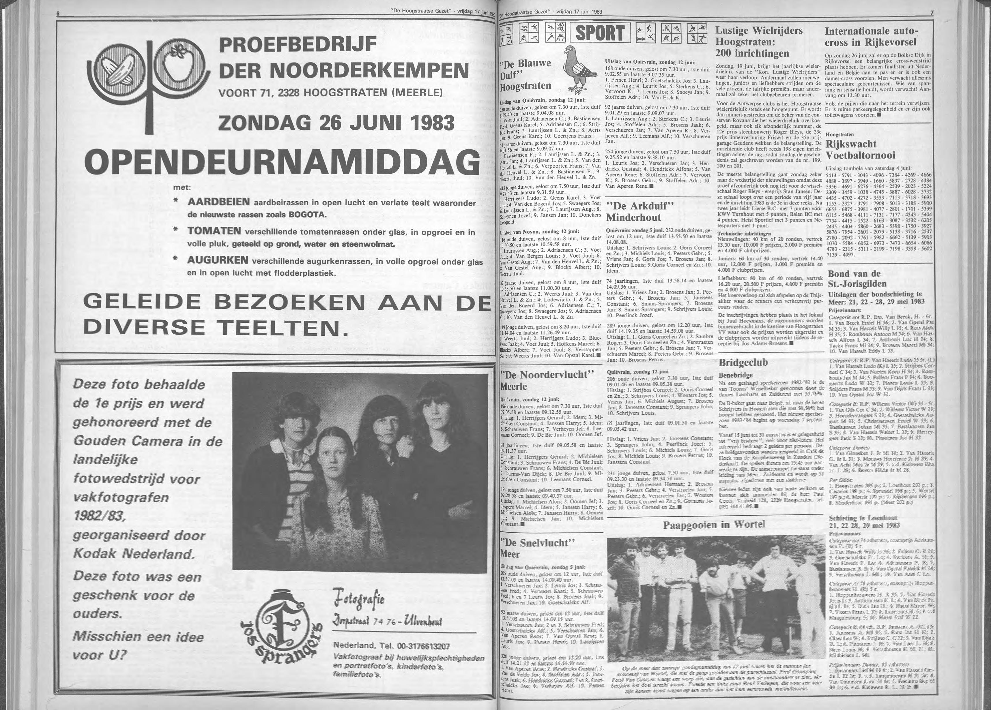 Goetschalckx Jos; 6. Van Aperen René; 7. Aertsen Jan; 8. Verheyen Alf.; 9. Verscbueren Jan; 10. Verheyen Alf. Uitslag van Quiévrain, maandag 23 mei: 68 oude duiven, gelost om 9 uur Iste duif 10.47.19; laatste: 10.52.43 uur 1. Verschueren Jos; 2. Goris Roger; 3. Goetschalckx Jos; 4. Van Opstal René;