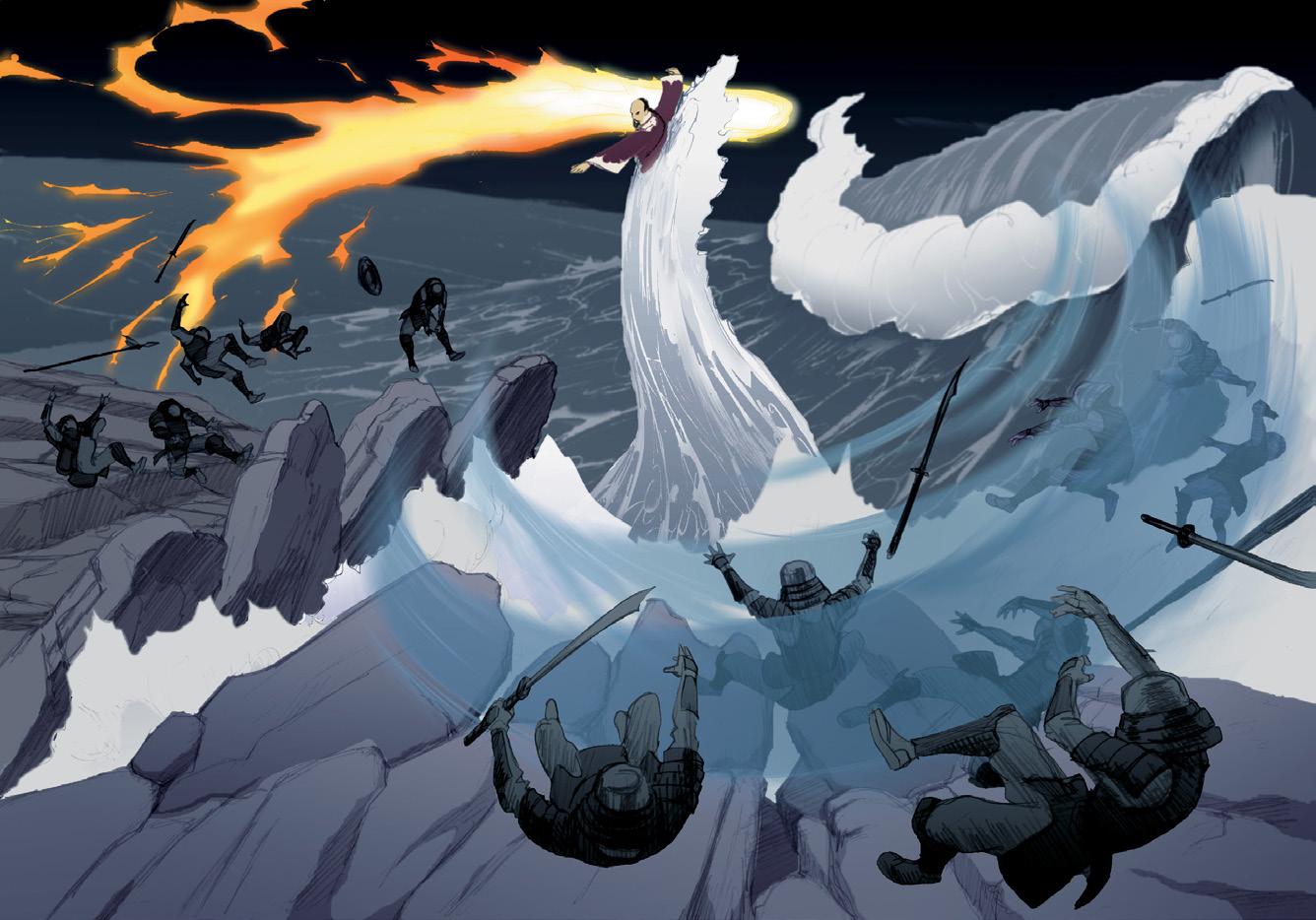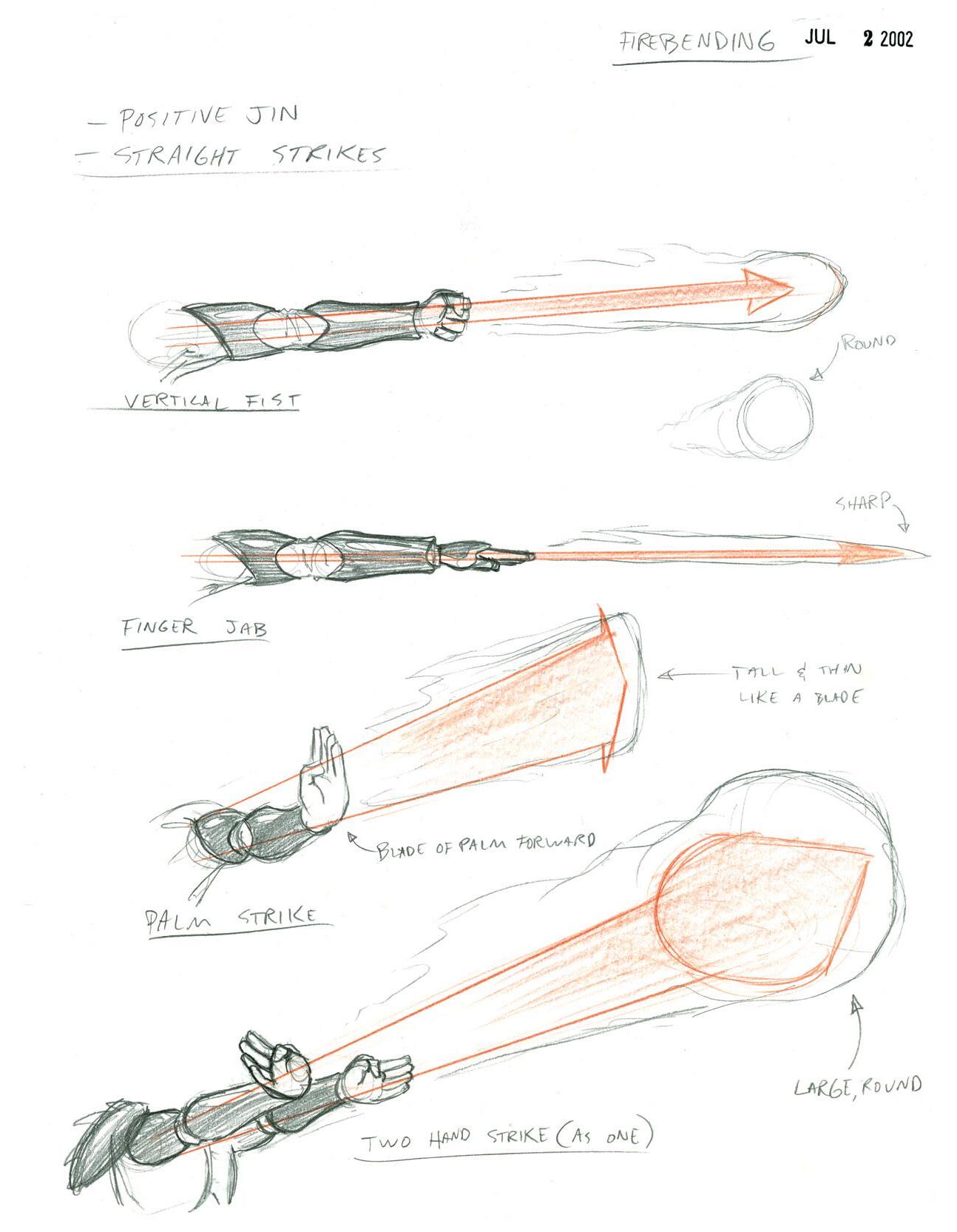 Left: While the concept of bending “sounded really cool to everyone,” early drawings like this one served as illustrations of “what it would actually look like,” says Konietzko. Below: The use of martial arts moves to manipulate the elements allowed for energetic action scenes without an emphasis on violence.