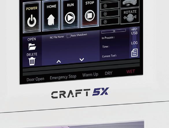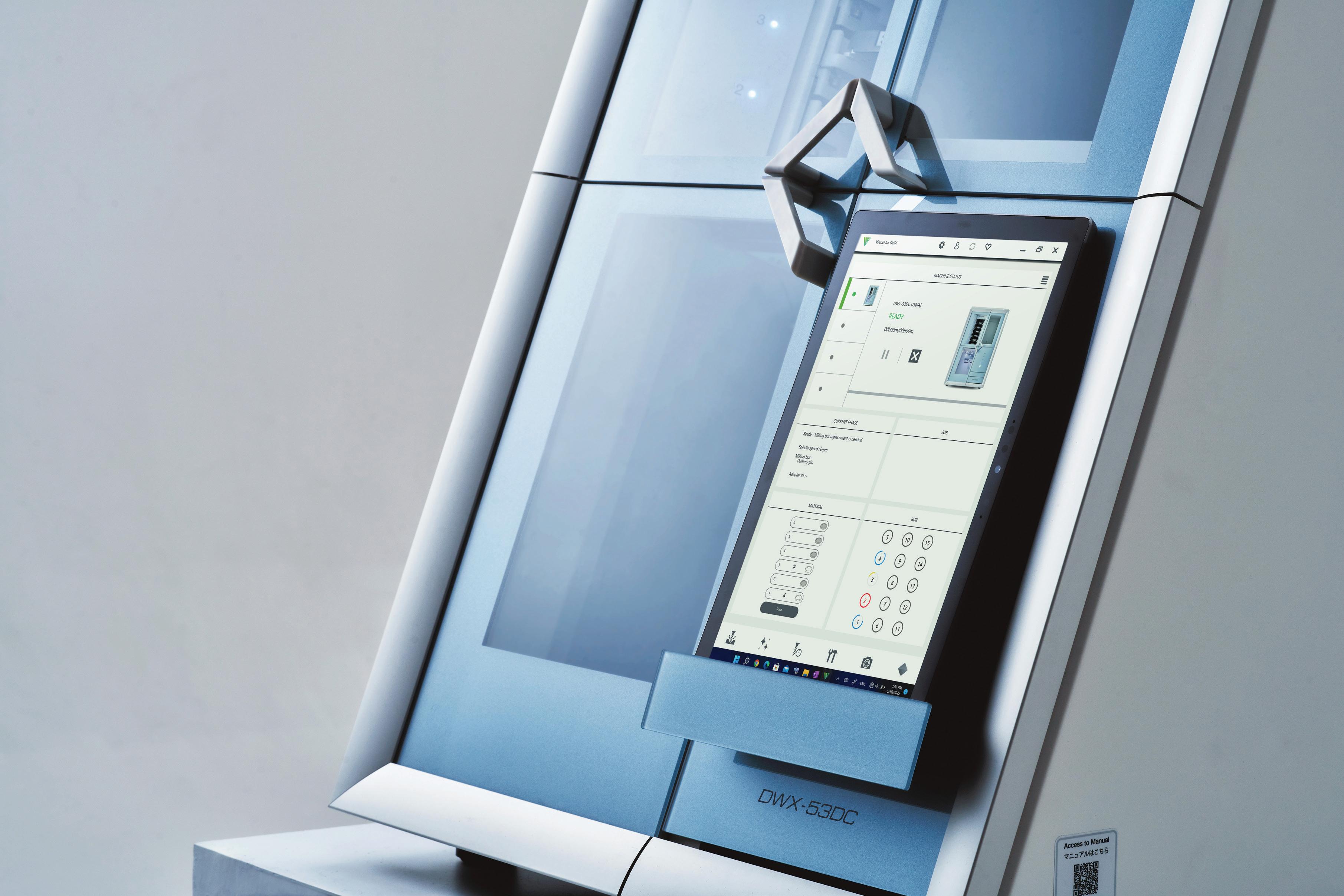 newly designed automatic disc changer. The milling chamber is sealed to keep milling waste away from other areas of the milling device and includes an ionizer to allow easy removal of PMMA milling waste. The DWX-53DC has a built-in camera that links the device with DGSHAPE CLOUD support. Users can view live production from anywhere with a mobile phone or tablet. The camera also provides recorded video, so users can troubleshoot their device and monitor maintenance activities. A new automated cleaning process also takes the work out of removing zirconia dust and waste from the device.