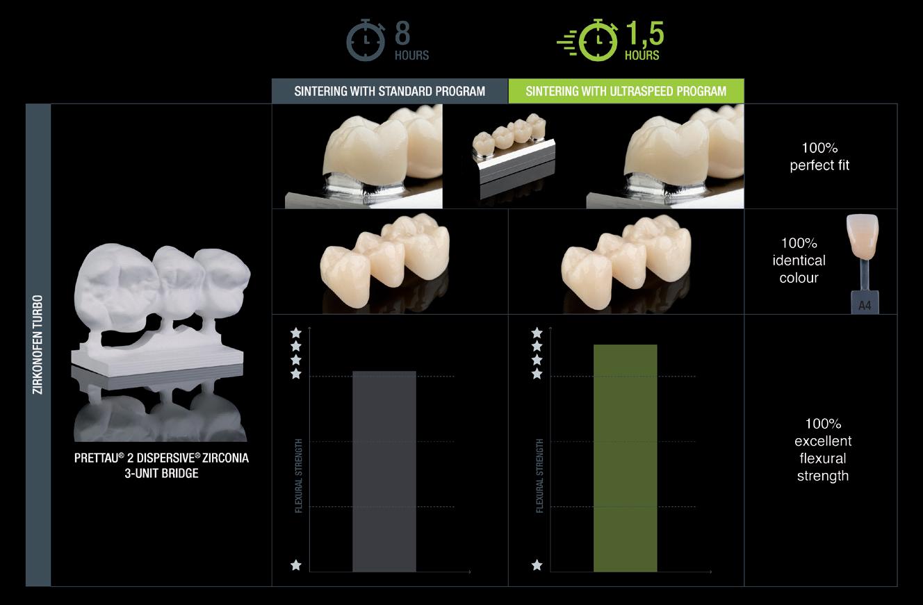 In addition, the pre-set Ultraspeed programs of the Zirkonofen Turbo, perfectly adapt to each kind of Zirkonzahn zirconia, allow to sinter small zirconia structures in about 90 minutes only, with no variation of flexural strength, colour and fit values. This cuts processing time by 81% and reduces electric consumption by 73%.