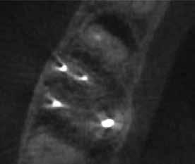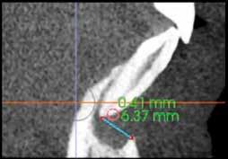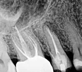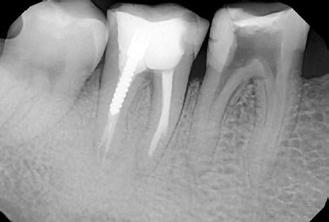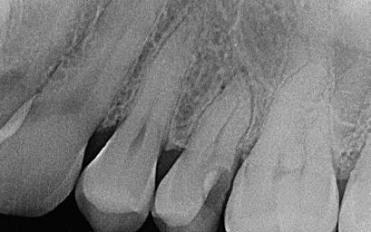 A gyökérkezelő tűk egy bizonyos mélység elérését követően folyamatosan a gyökér mezialis oldalán elhelyezkedő reszorbeálódott területbe vezették magukat. Emiatt a reszorpció által okozott defektus zárása mellett döntöttünk (9. a–c. ábrák). A