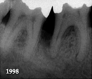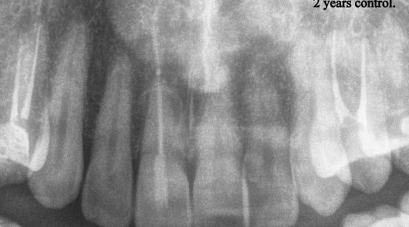 A kezelést követően a beteg tünetmentes volt. A kérdéses fog a kontrollvizsgálatok során végzett szenzibilitástesztekre fiziológiás reakciókat adott. A hat hónapos kontroll alkalmával készített röntgenfelvételen a sérülésnek megfelelően széles dentinhidat észleltünk (2. ábra). A restaurátum a hároméves kontroll során is megfelelőnek bizonyult (3. ábra)