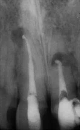 11. a–c. ábrák: A jobb felső nagymetszőfog (1.1) kezelése során készült radiológiai felvételek. Kiindulási röntgen: jól látható a gyökér-reszorpció és a gyökér oldalán elhelyezkedő radiolucens terület (a). A teljes munkahosszon levezetett mester poénról készült felvétel (b). Az endodonciai ellátás befejezését követően készített felvétel (c).