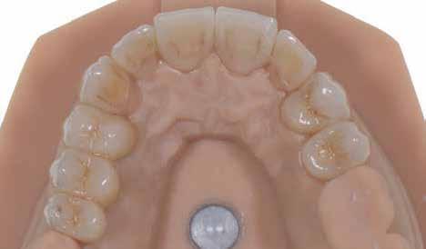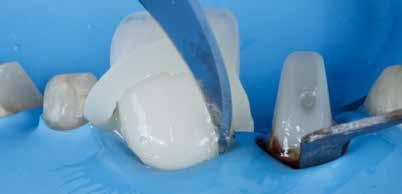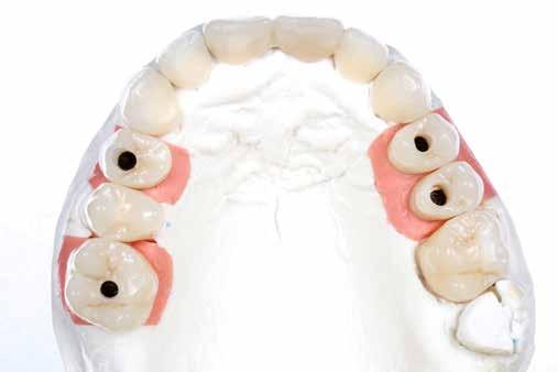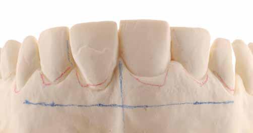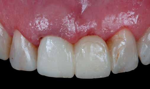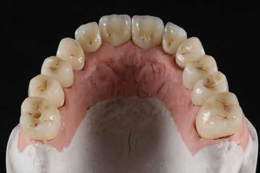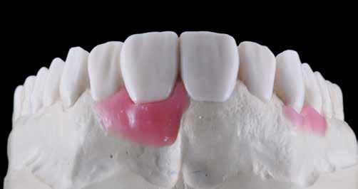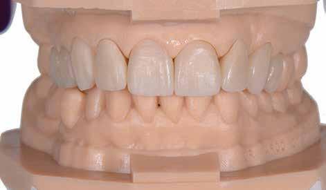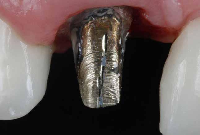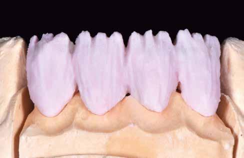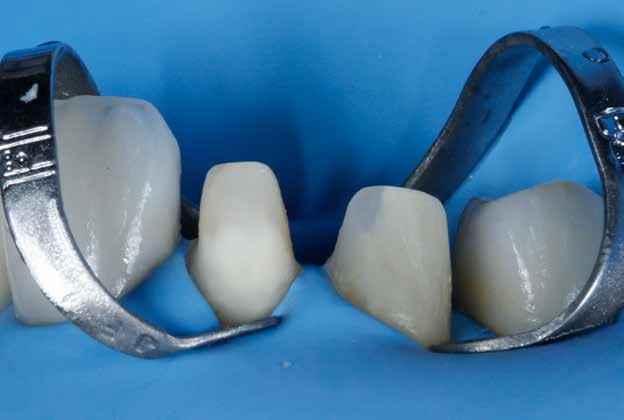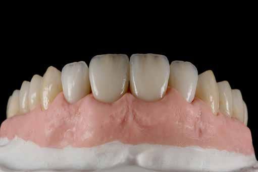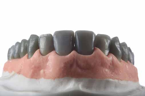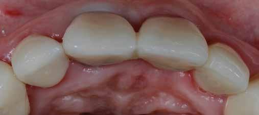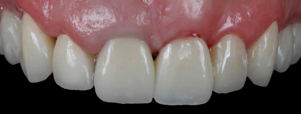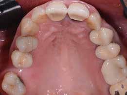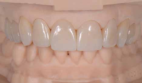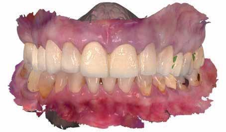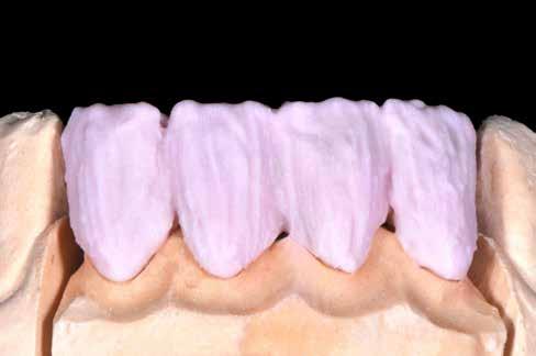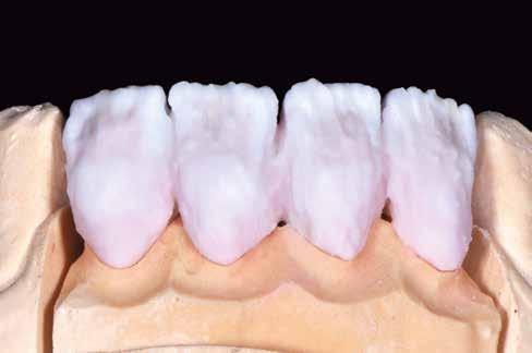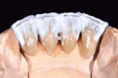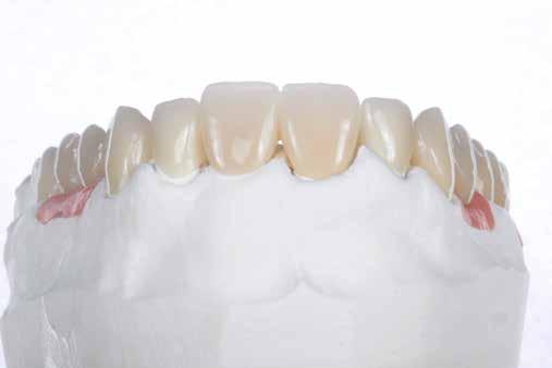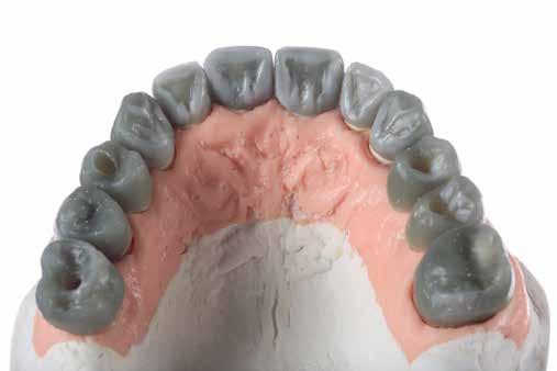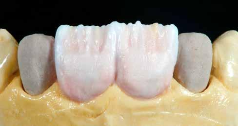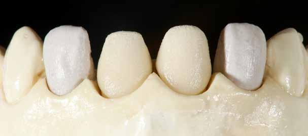 érzéstelenítést követően átvágtuk és leemeltük. A fogcsonkokról ismételt preparálás után lenyomatot vettünk. Az oldalsó metszőfogakon tűzálló csonkokkal mestermintát készítettünk. A minta szkennelése után megterveztük a nem nemesfém koronavázakat a 11-es és 21-es fogakhoz, amiket Ceramill Motion 2 marókészülékkel Ceramill Sintron-ból csiszoltunk ki (mindkettő gyártója Amann Girrbach, Pforzheim, Németország).