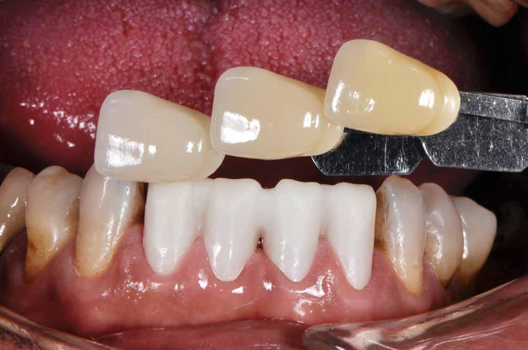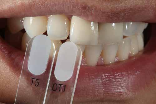 A módszeres színhelyreállítás érdekében a fog alapszínét és az egyéb színárnyalatokat és -effekteket több lépésben állapítottuk meg. Elsőként a VITA classical A1-D4 színkulcscsal azonosítottuk a fog A1-es alapszínét, és azt fotografikusan rögzítettük. Ezután a VITA VMK Master LUMINARY és TRANSLUCENT színminták segítségével meghatároztuk a természetes fogazat transzlucens színárnyalatait és fluoreszcens effektjeit. Végül a 11-es és 21-es koronákat helyi