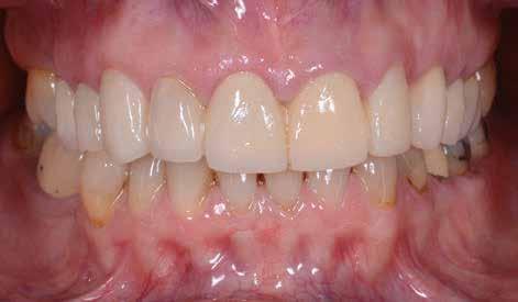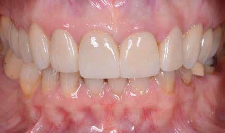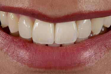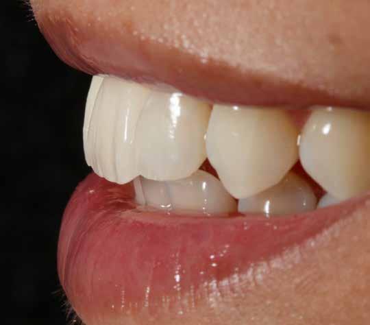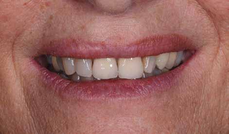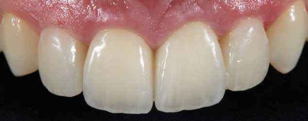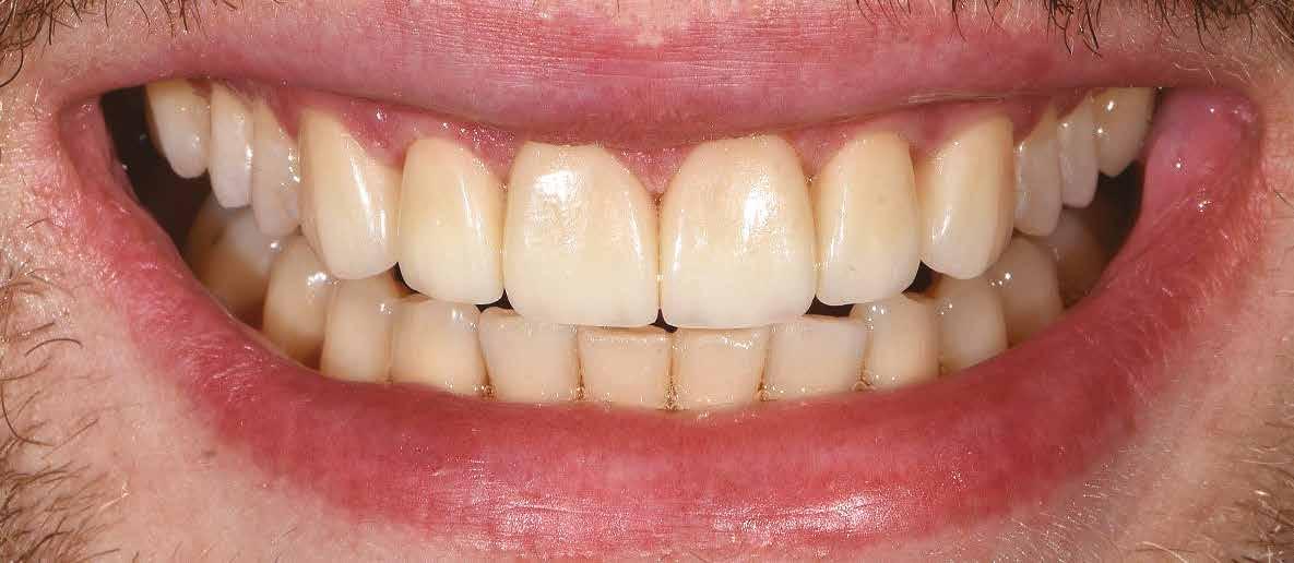 A héjat hasonlóképpen festékekkel és polírozással véglegesítettük. A klinikai bepróbálás után a négy fogpótlást adhezív módon rögzítettük. A fém koronavázakra készült leplezés és az adhezíven a zománcra cementezett, VITA VMK Master-ből készített non-prep héjak abszolút harmonikus végeredményhez vezettek az esztétikai zónában.