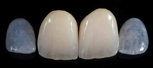 A koronákat a második dentinégetés után finom gyémánttal és gumipolírozóval átdolgoztuk, majd incizális régióban VITA AKZENT Plus EFFECT STAINS 01 (ES01) festékkel fehérre karakterizáltuk. A színtelítettséget approximálisan ES02 (creme) és ES07 (khaki) festékkel fokoztuk. A színrögzítő égetést, majd a VITA AKZENT Plus GLAZE-zel végzett glazúrégetést követően a végső polírozást finom gumipolírozóval végeztük.