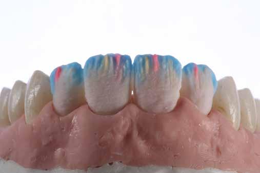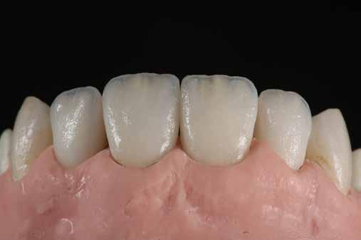 A nem nemesfémből készült koronavázakat vékonyan bevontuk VITA NP BOND-dal, ami egyfajta HTE-pufferként feszültségmentes és tartós leplezést biztosít. A mosóégetéshez kiegészítésként VITA SPRAY-ON OPAQUE POWDER A1 (OP1) port vittünk fel. A mélységi fluoreszcencia fokozása céljából az első dentinégetést VITA VMK Master LUMINARY 1 (fehér) és 4 (világos barnás-narancs) anyagokkal végeztük. A dentinmagot ezt követően anatómikusan redukáltuk, A1 DENTINE réteget vittünk fel rá, majd approximálisan TRANSLUCENT 5 (T5: világoskék), mamelon régióban pedig NECK 4 (N4: narancs) masszákkal individualizáltuk. A koronák zománctartományát fehéres ENAMEL 1 (70%) és neutrális TRANSLUCENT 4 (30%) keverékével építettük fel. A rétegtechnikával előállított non-prep héjakhoz úgyszintén az ENAMEL és TRANSLUCENT masszákat használtuk, a fent megadott keverési arányban.