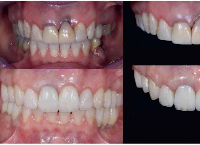 Egy 34 éves páciens kereste fel dr. Henrique Breda Rafalski fogorvosi rendelőjét. A hölgy elégedetlen volt felső frontfogainak esztétikai megjelenésével. A 11-es és 21-es fogon lévő fémkerámia koronák élettelennek hatottak, színük nem illeszkedett megfelelően a fogazatba. A fogak tengelye, a metszőélek és a fogív, valamint a morfológia nem voltak harmóniában egymással. A 11-es fogon lévő fémcsapos csonkfelépítmény alapján a középső metszőfogakat új fémkerámia koronákkal kellett ellátni. A cervikális régió vörös-fehér esztétikájának helyreállítását kerámia vállal kellett helyreállítani. A 12-es és 22-es fogakra non-prep héjakat terveztünk, hogy egyenletesebbé tegyük a fogívet. A koronák és a héj készítéséhez a VITA VMK Master leplezőkerámiára esett a választás.