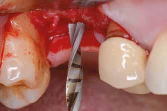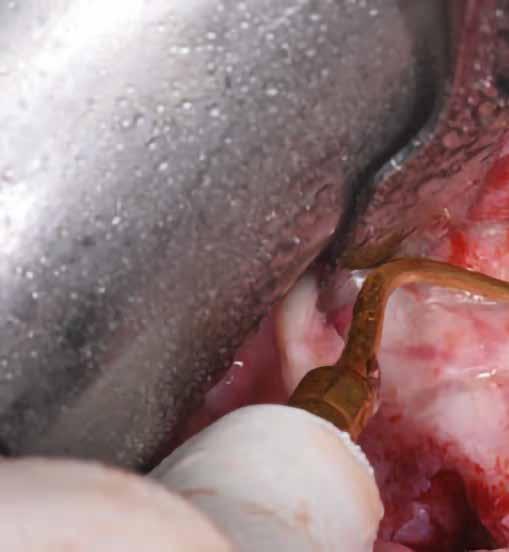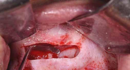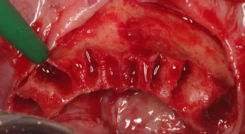 A kétoldali sinus lift előtt újabb klinikai és radiológiai vizsgálatot végeztünk, hogy megnézzük, mennyire lesz nehéz a beavatkozás [19]. Helyi érzéstelenítést (4%-os artikain 1:100 000 adrenalinnal) követően a fogatlan állcsontgerinc mentén két kresztális metszést ejtettünk. Divergáló segédmetszésekkel egészítettük ki a szemfogaknak és a tubereknek megfelelő területen, majd két, teljes vastagságú lebenyt preparáltunk, hogy bukkálisan hozzáférhessünk az arcüregek laterális falához. Két laterális csontablakot preparáltunk, piezo készülék segítségével (3. ábra) . Különös figyelmet fordítottunk arra, hogy óvatosan válasszuk le a sinus nyálkahártyát, hogy elkerüljünk egy esetleges perforációt [20]. Speciális sinus kanalakat használtunk, addig végeztük a leválasztást, amíg az implantátumokhoz kellő magasságot el nem értük (4. ábra) . A tuberbe egy kollagén szivacsot helyeztünk, hogy megemelve tartsuk a nyálkahártyát és mikrofuratokat készítettünk, hogy fokozzuk a vaszkularizációt, ezáltal a csontregenerációt. Ezt követően egy kollagén mátrixban lévő heterológ „sticky bone” („ragadós csont”) csontpótlót (OsteoBiol GTO, Tecnoss)